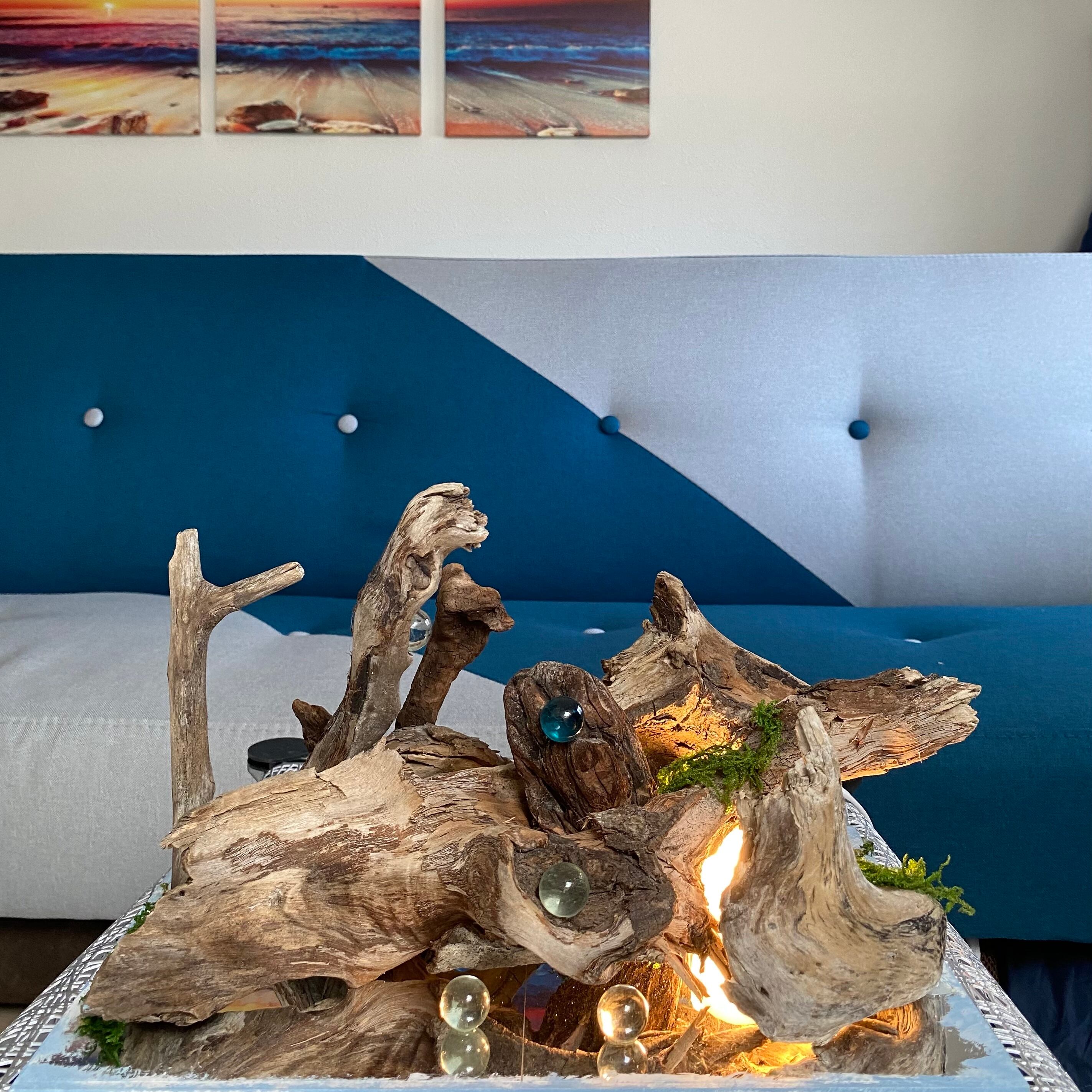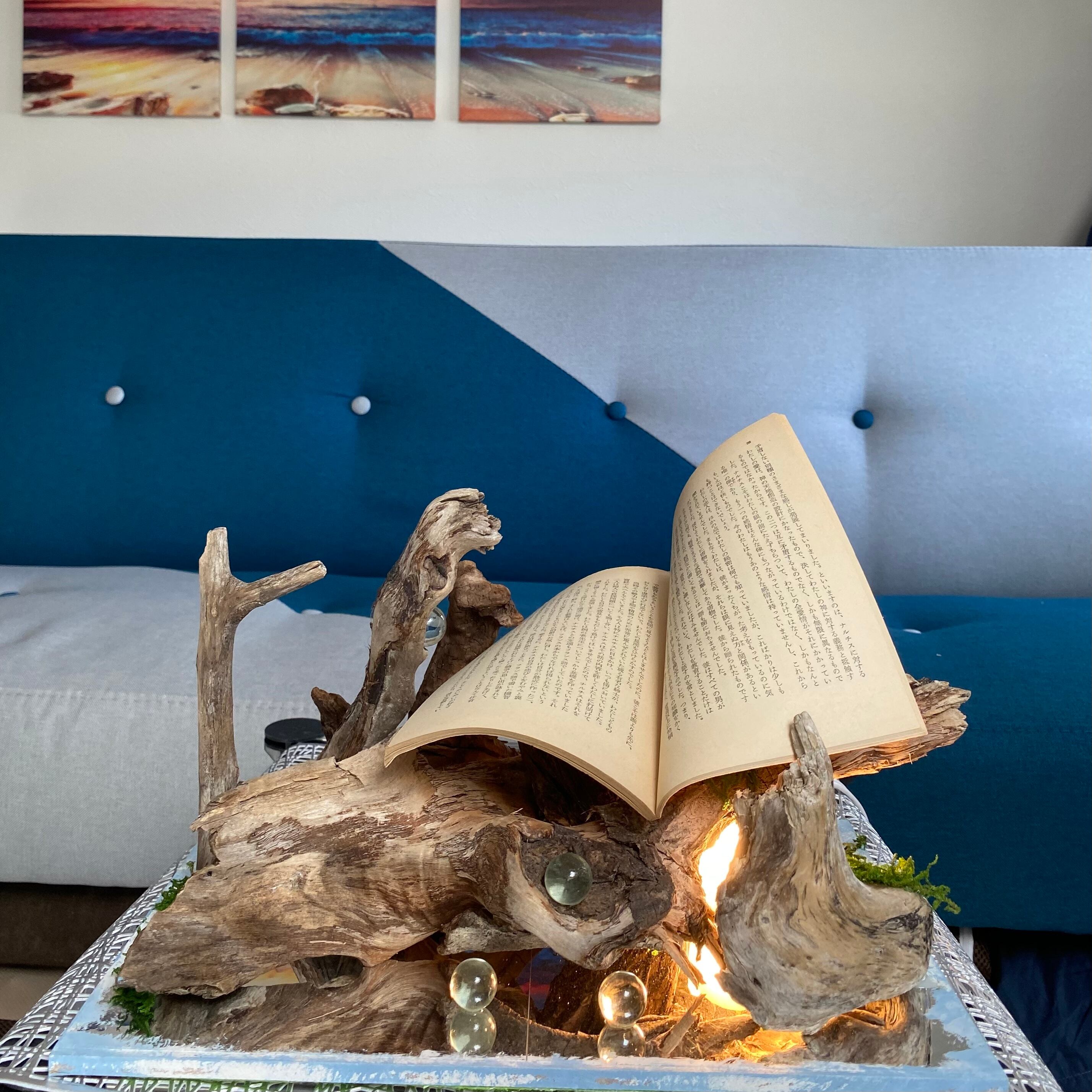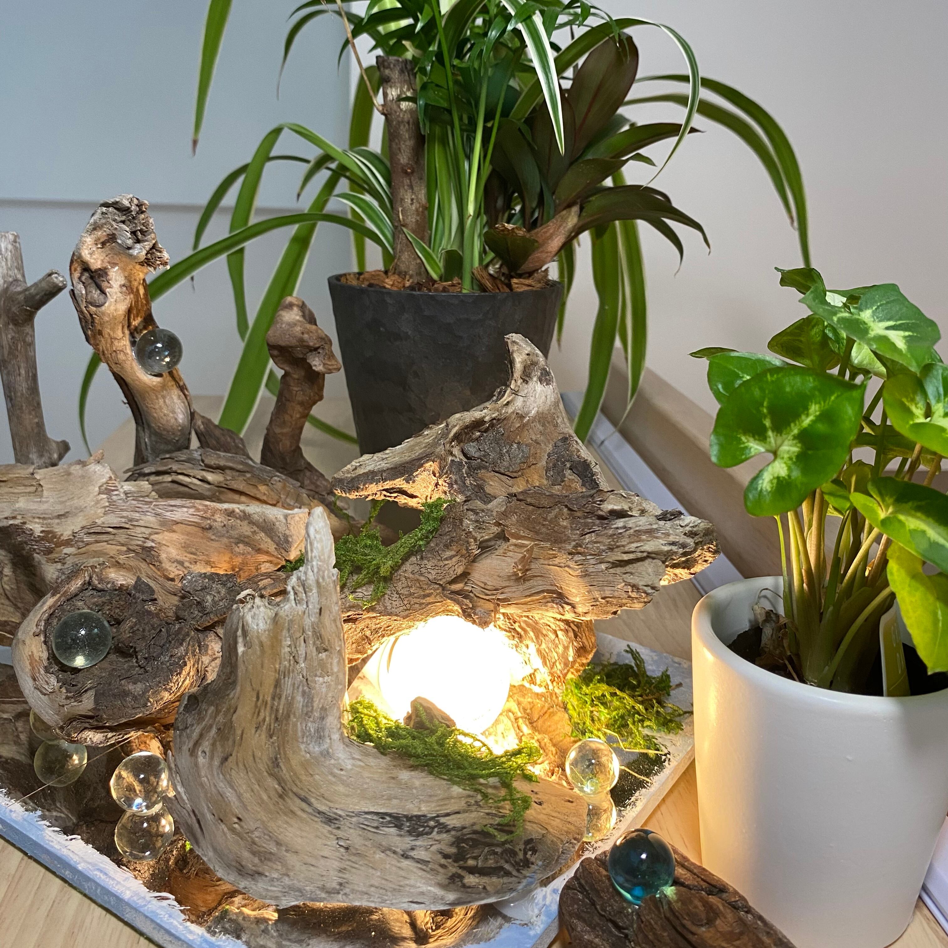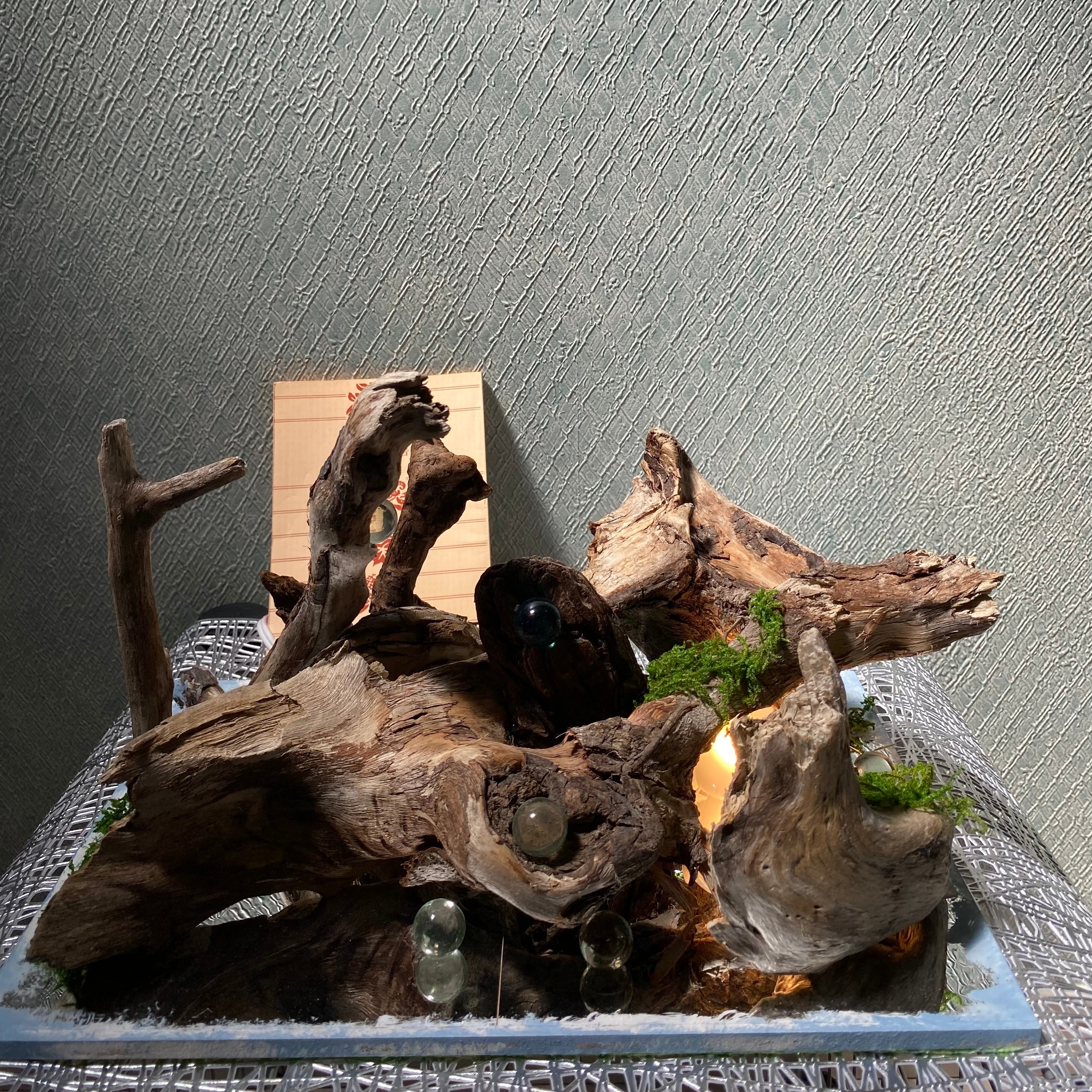 横幅30センチのプレートに流木とライトを組み込んだ癒しのアート作品です