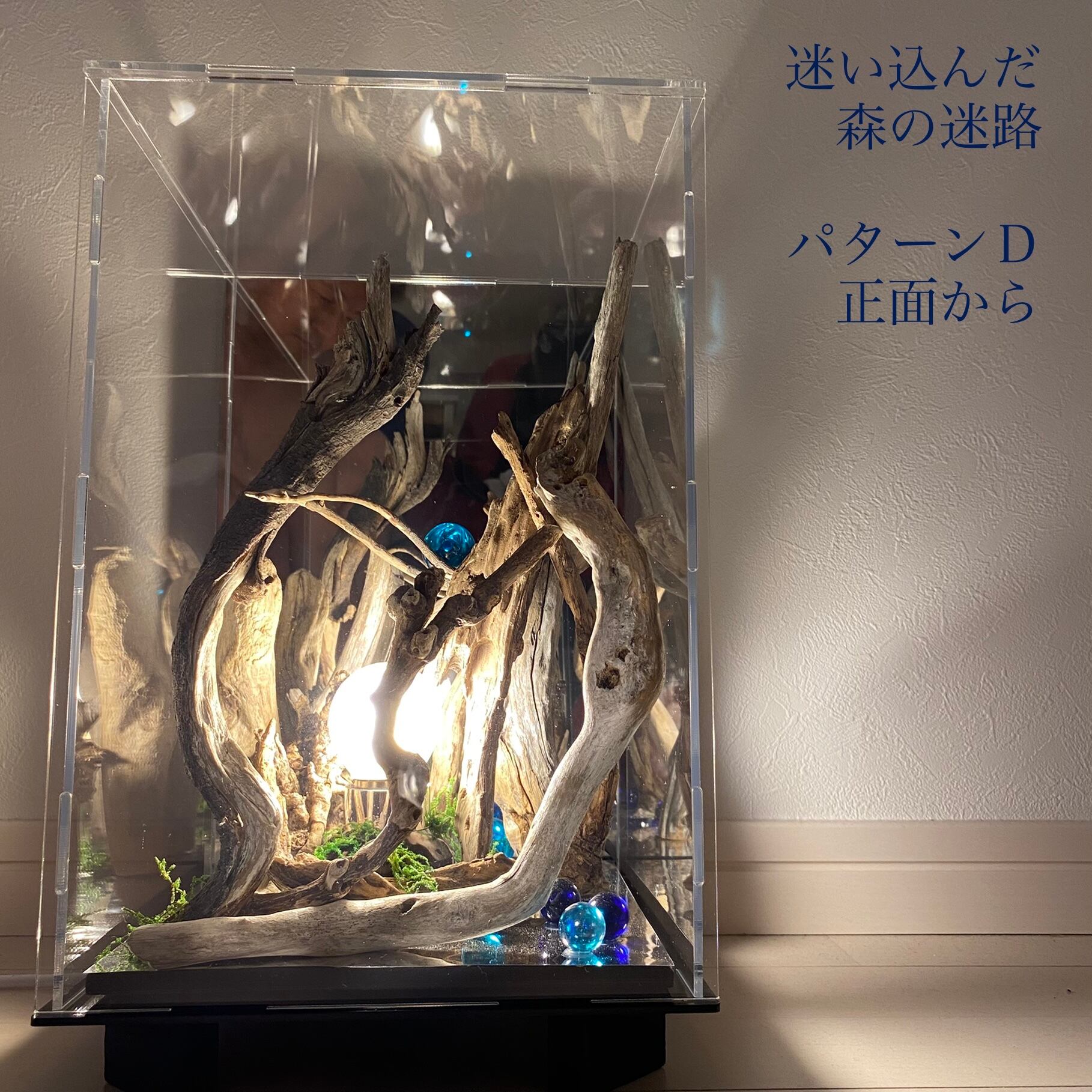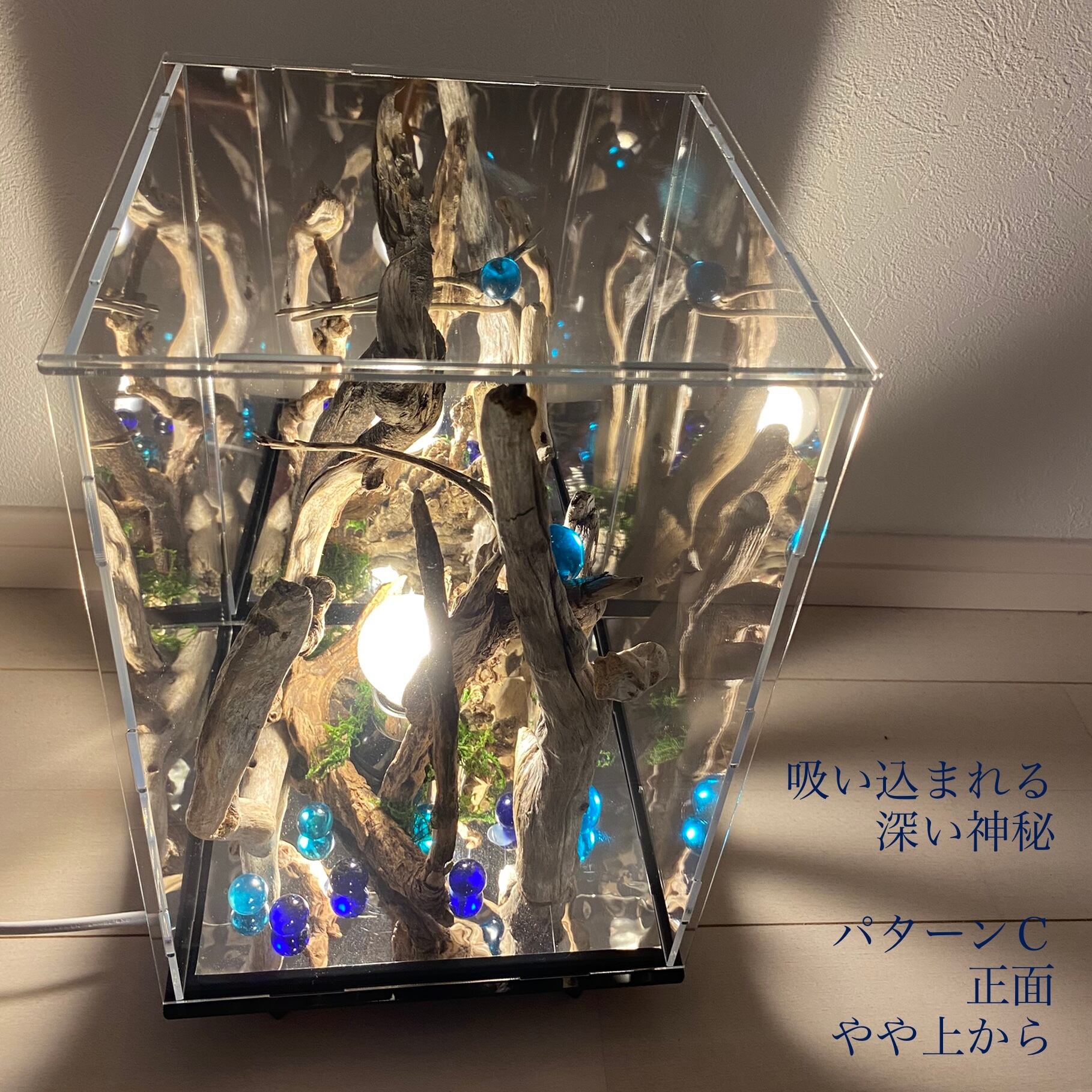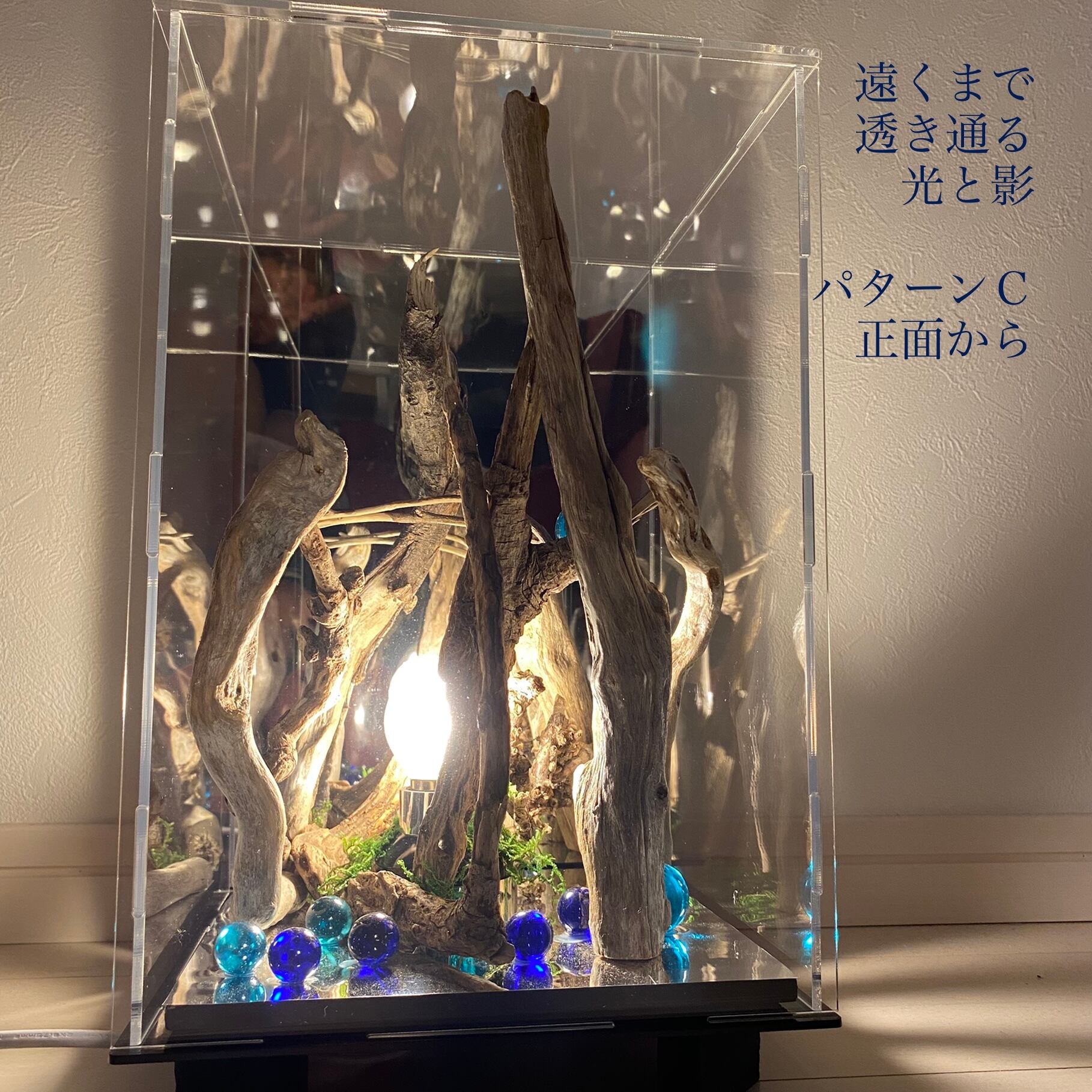 アクリルプレートに流木とライトを組み込んだ癒しのアート作品です