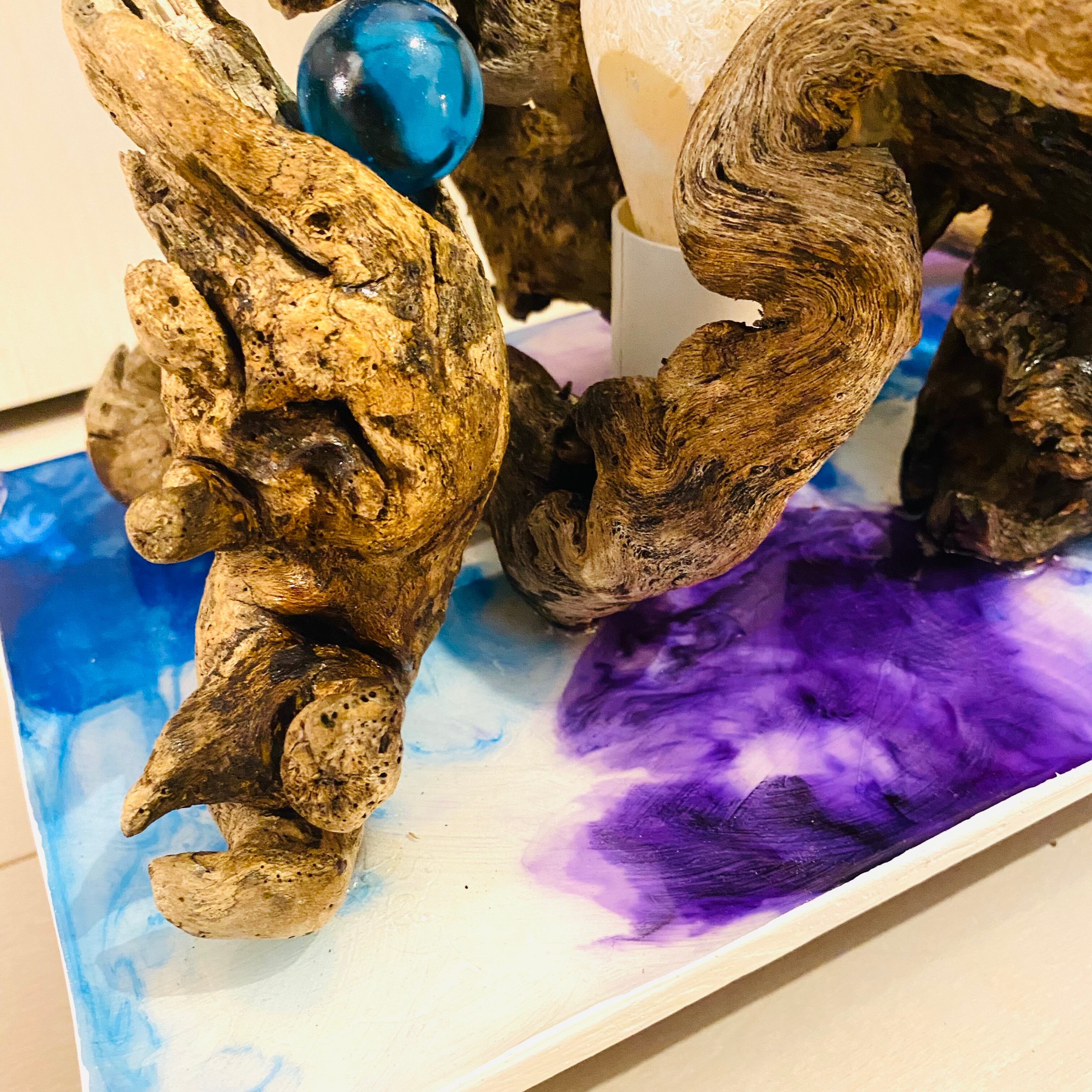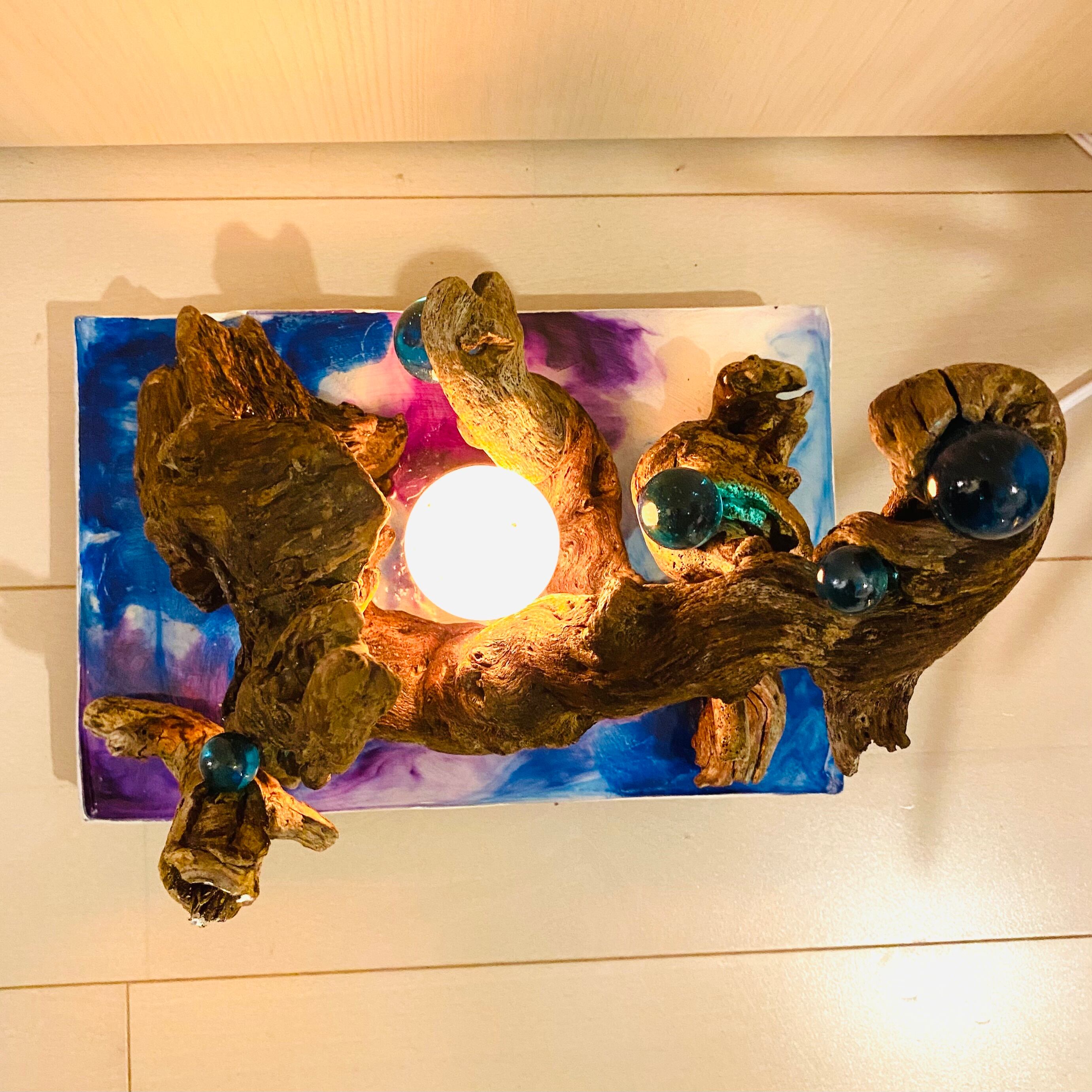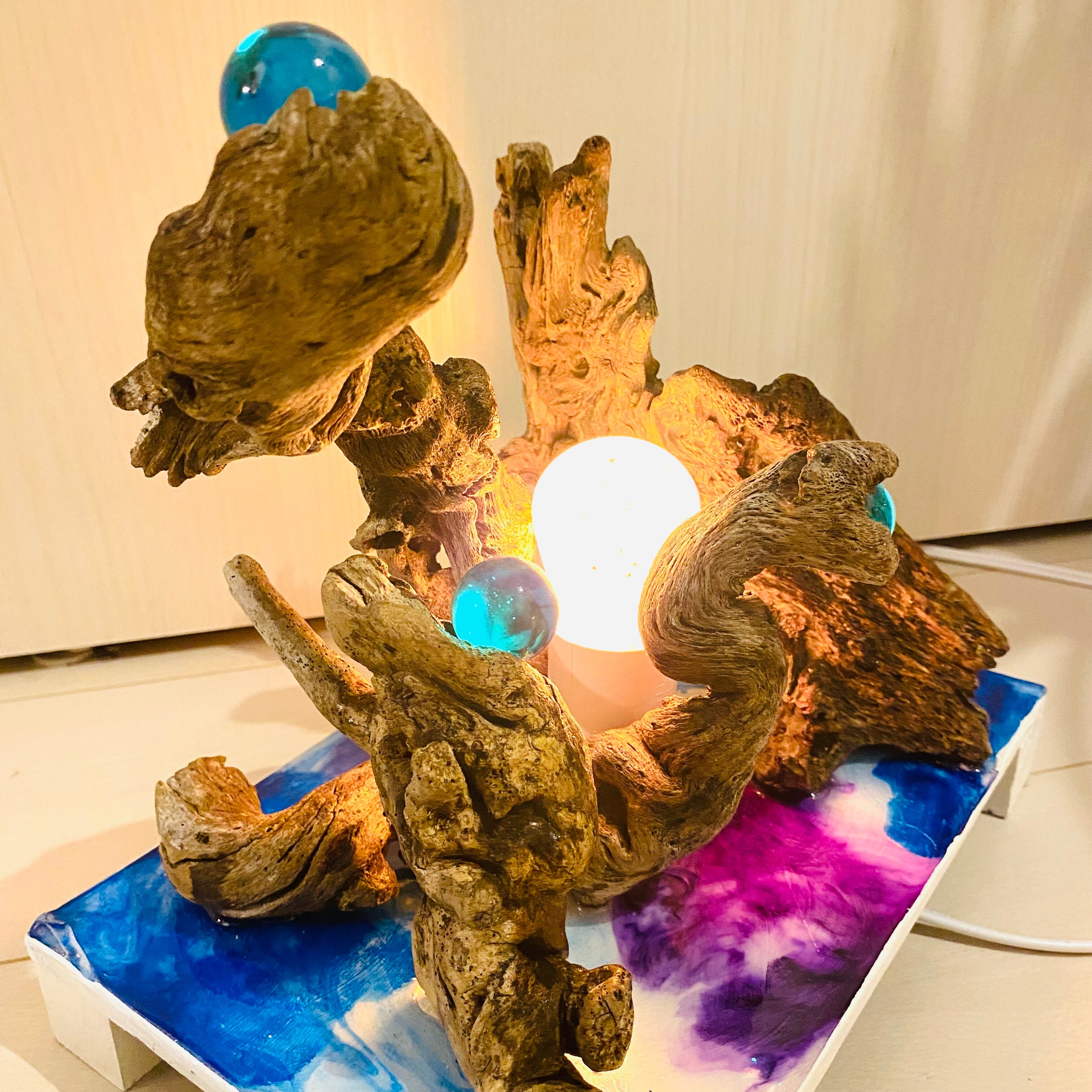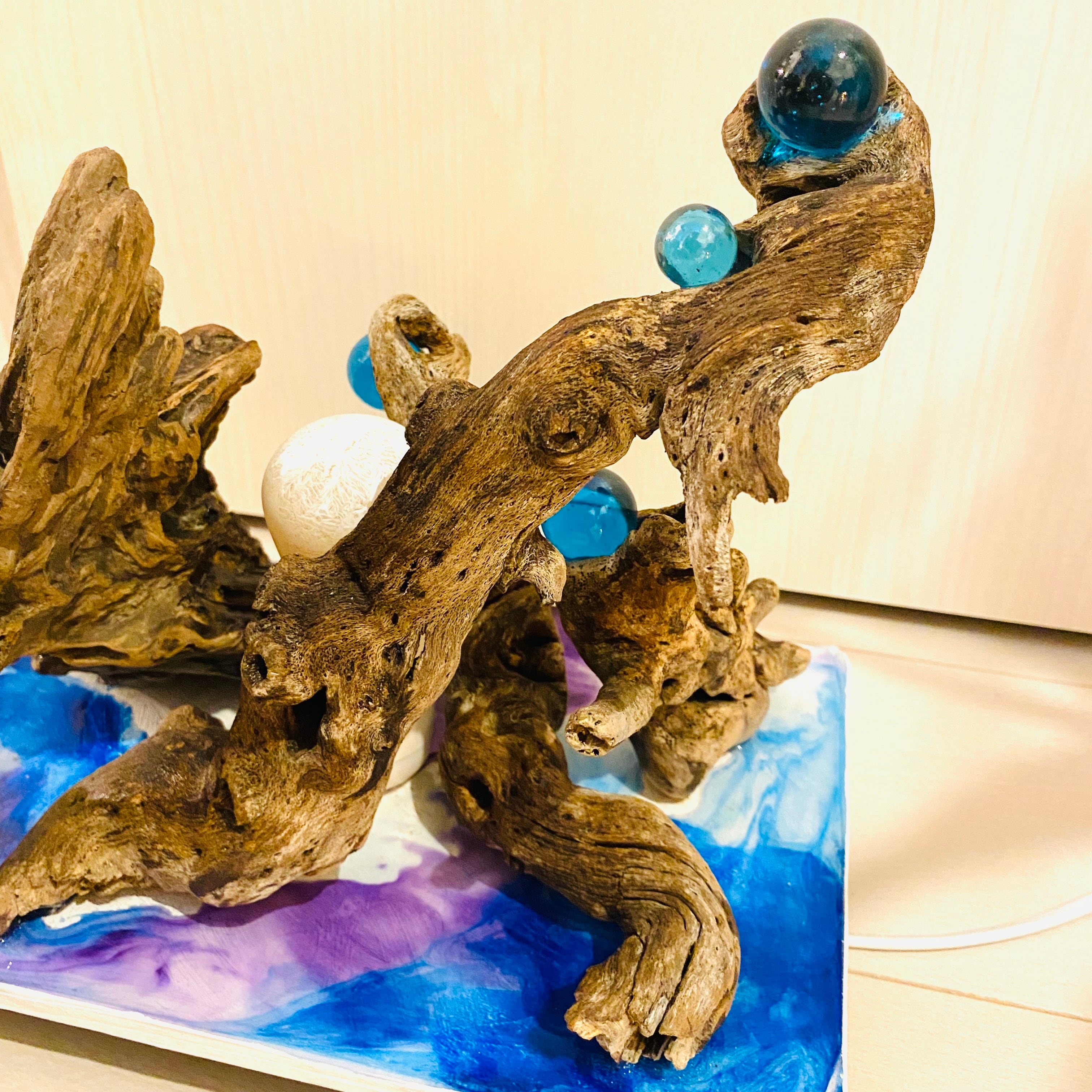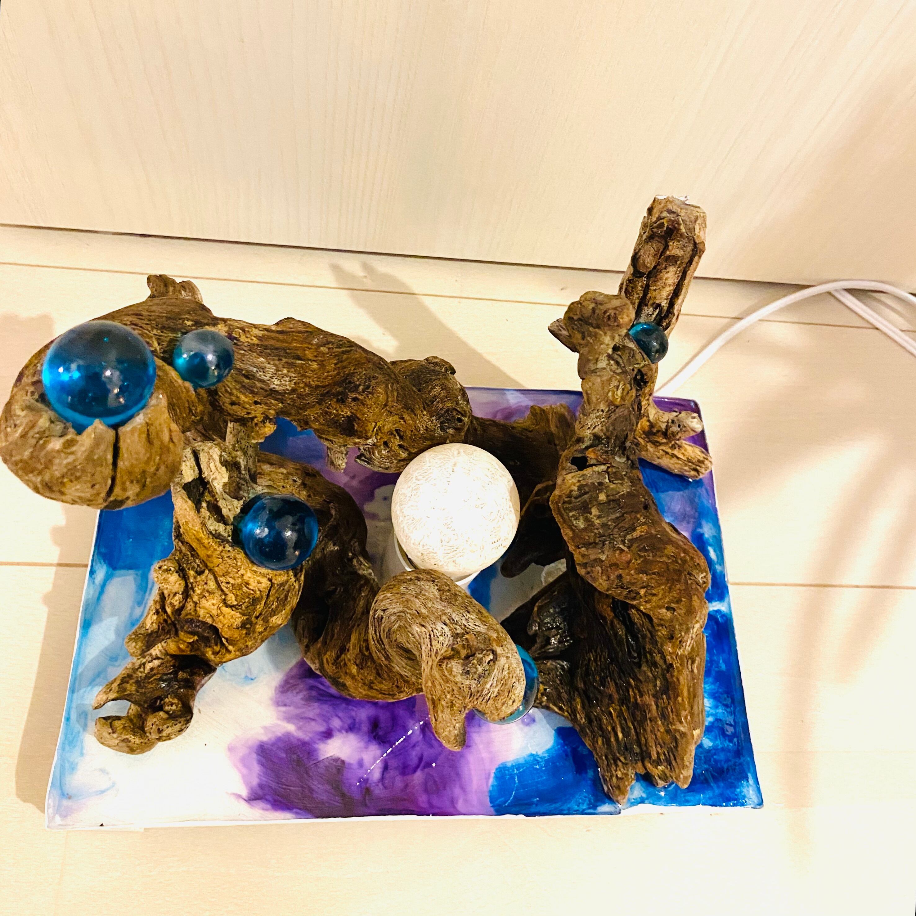 プレートに流木とライトを組み込んだ癒しのアート作品です