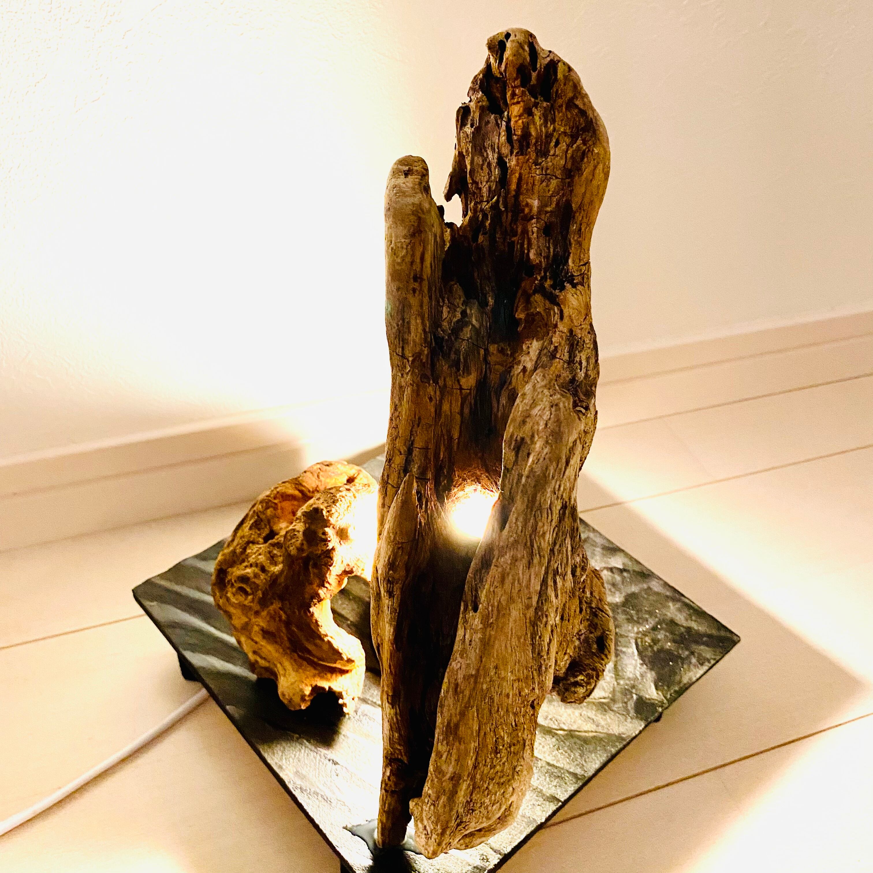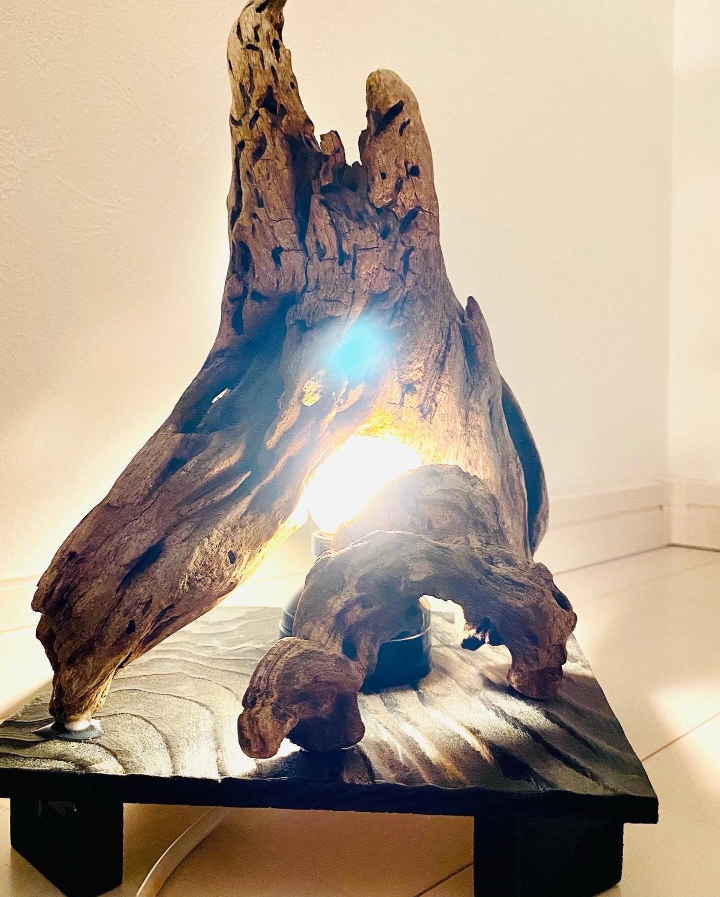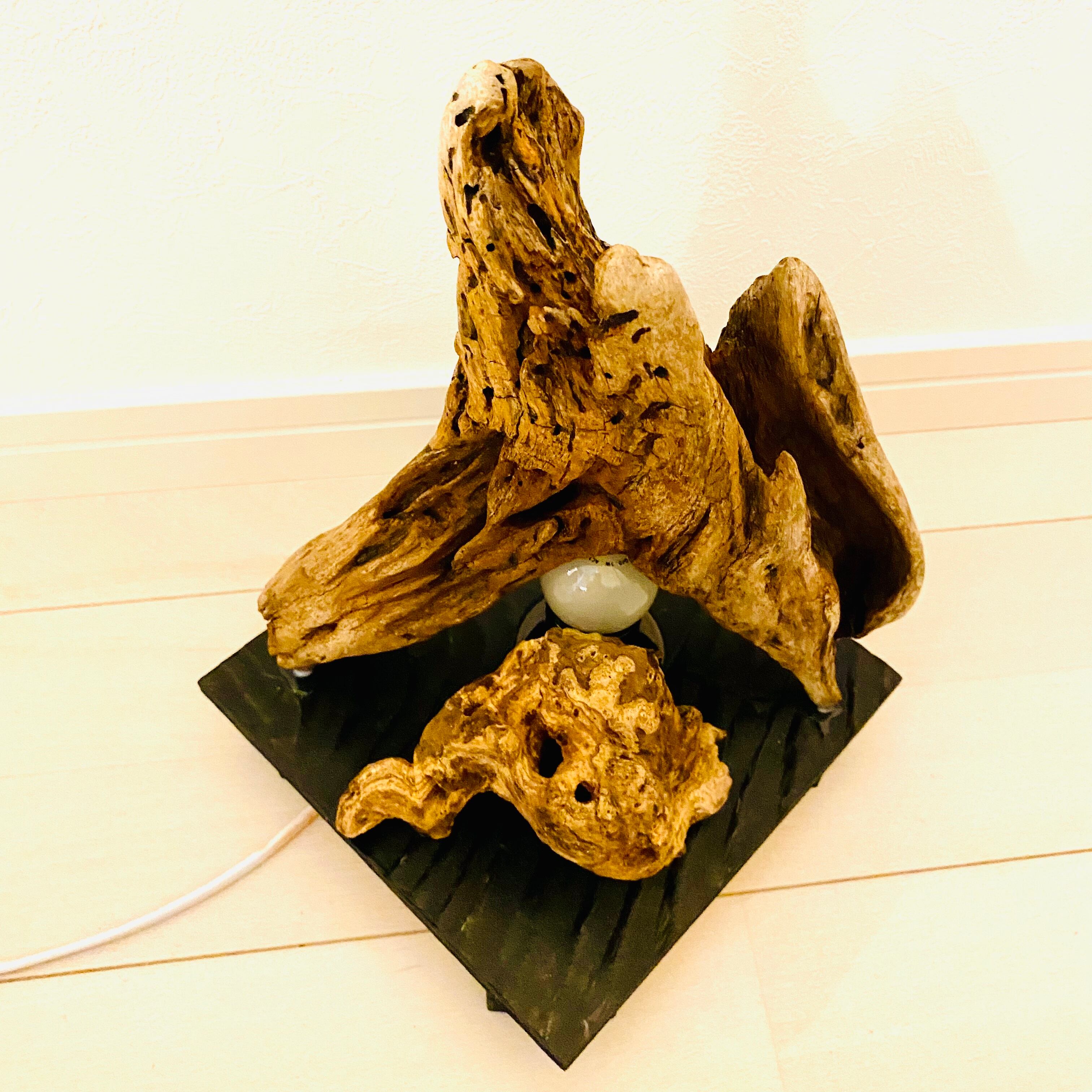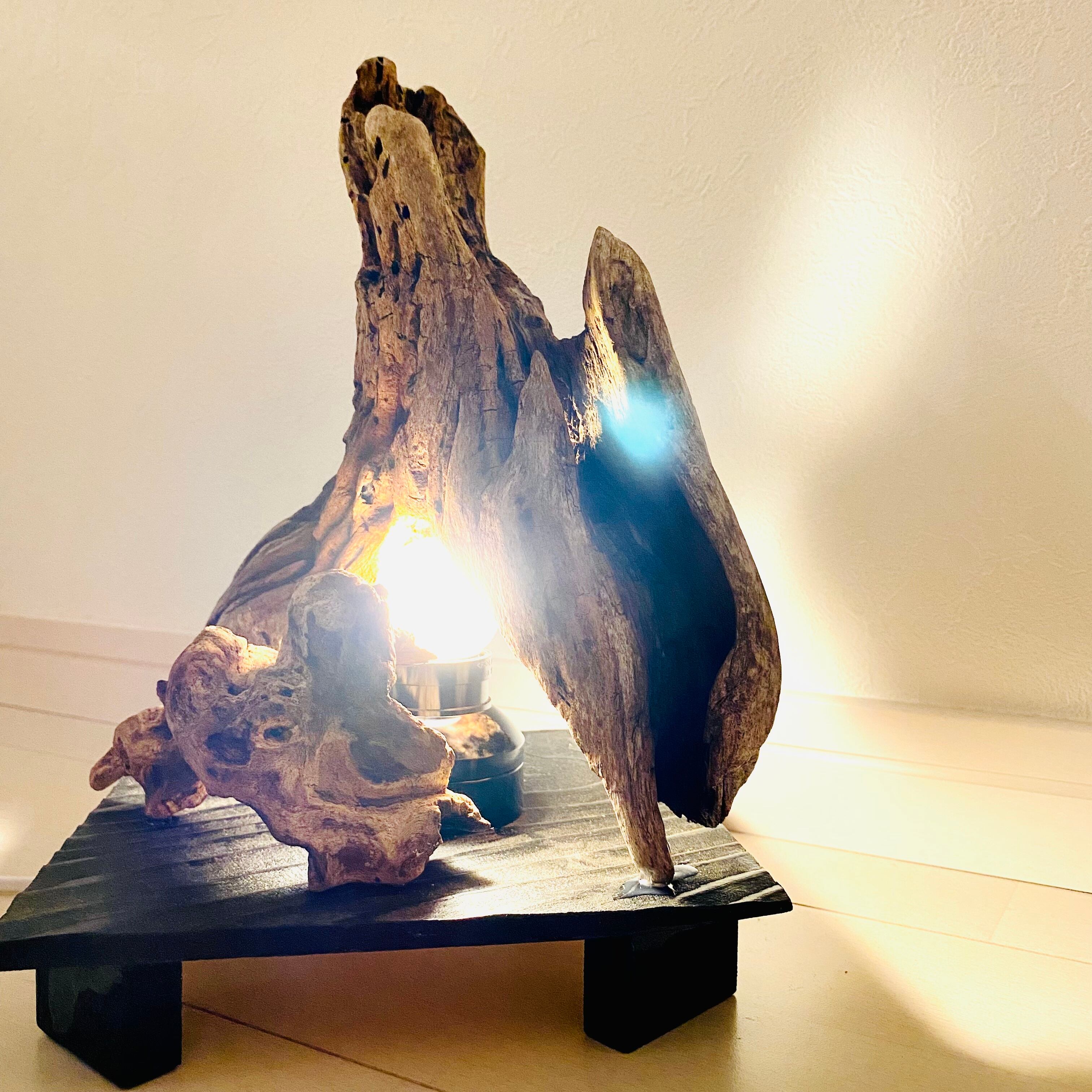 プレートに流木とライトを組み込んだ癒しのアート作品です
