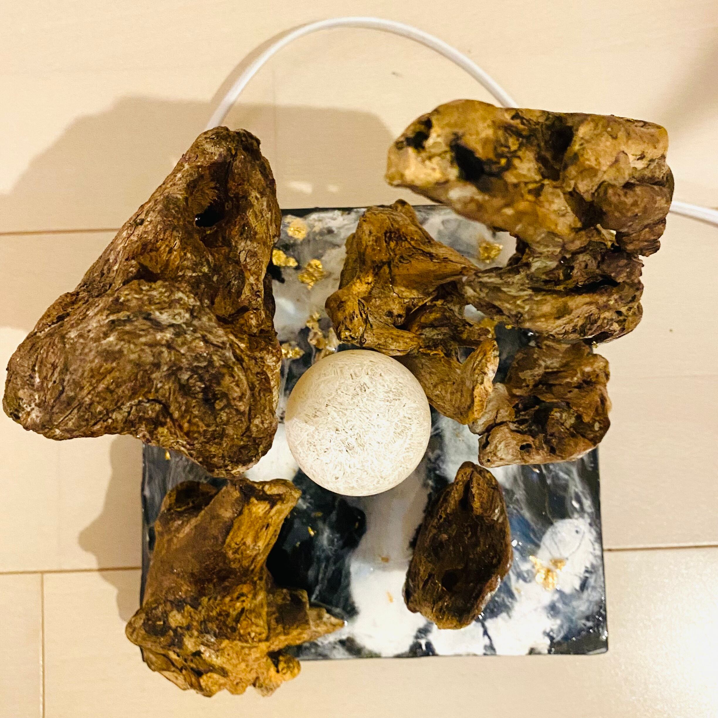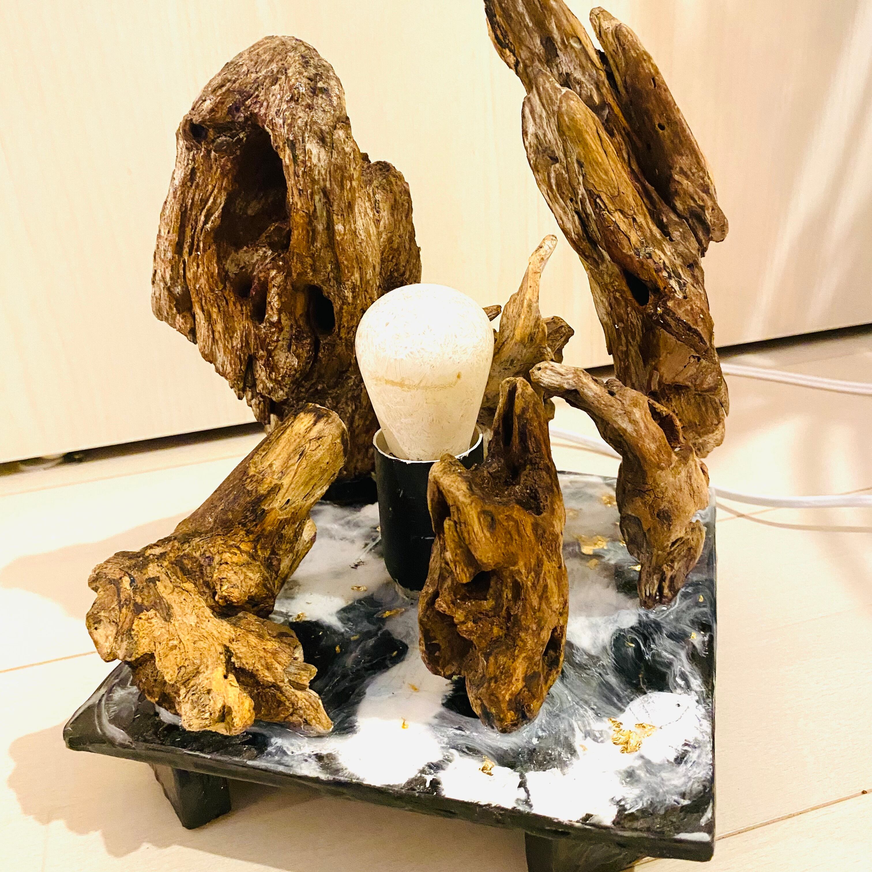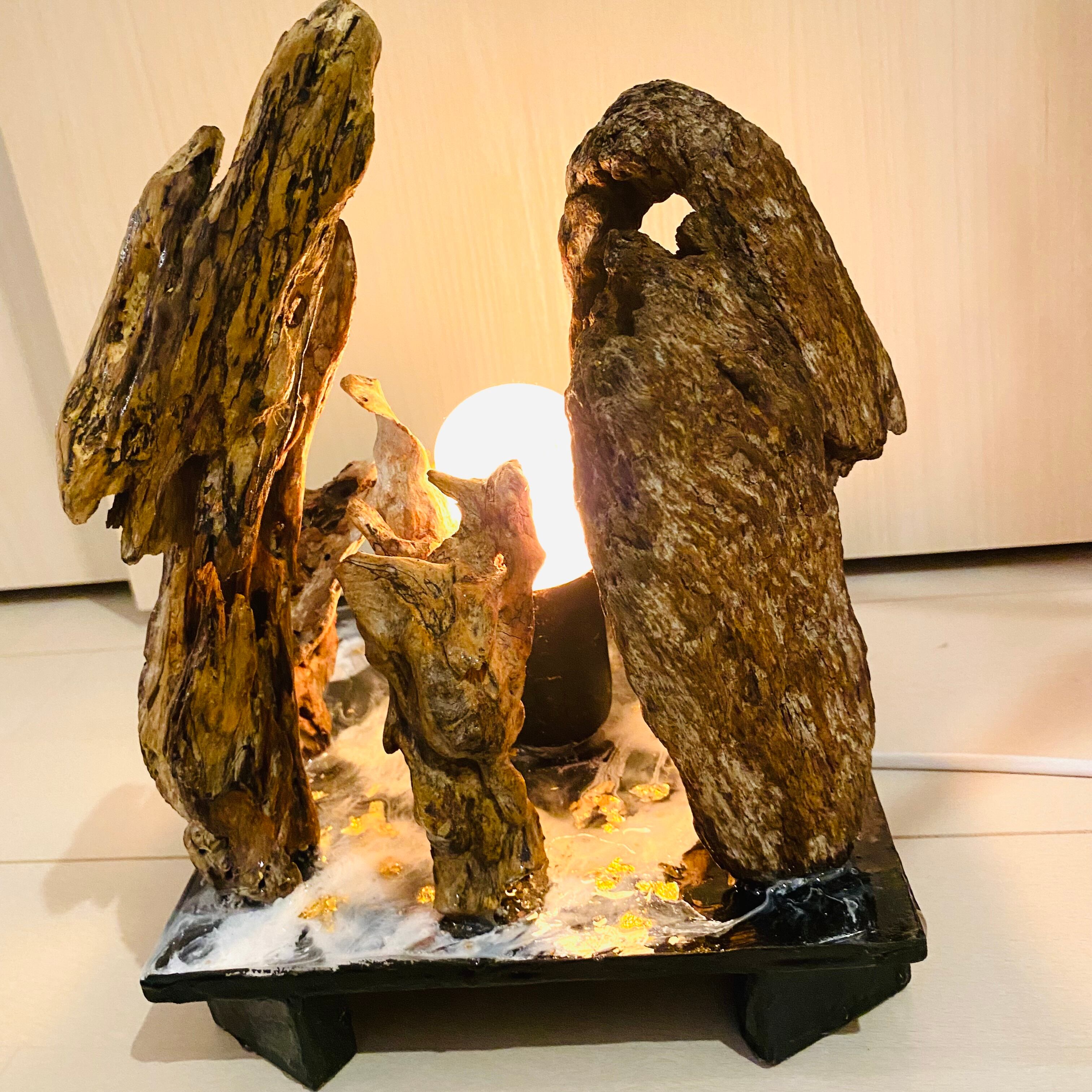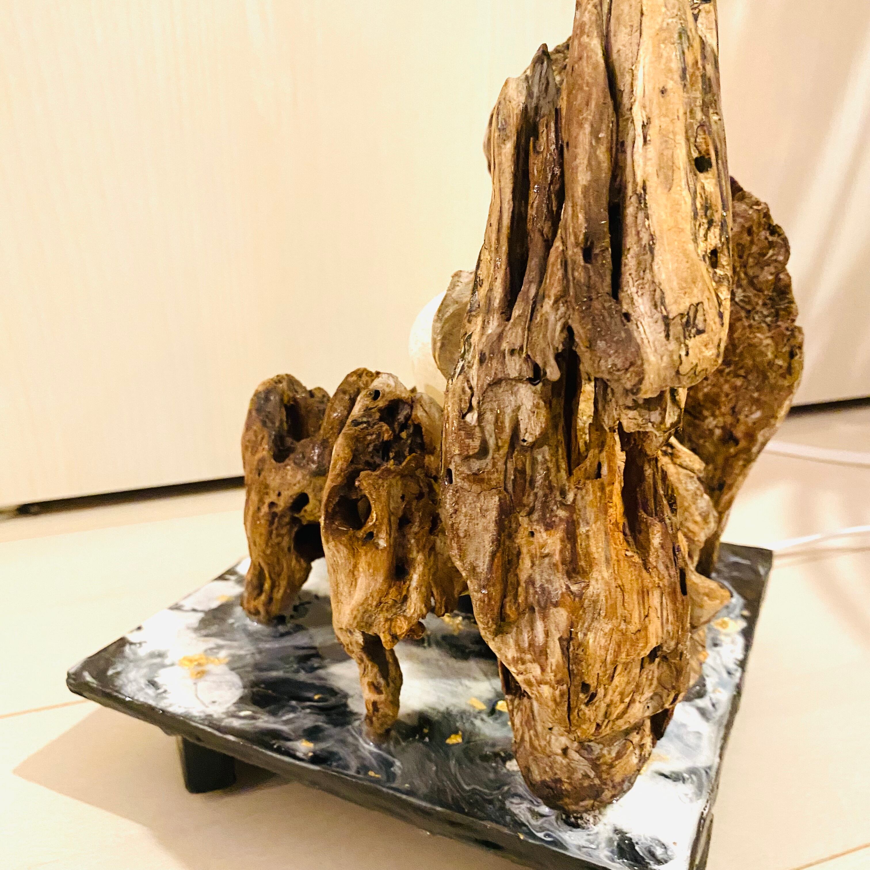プレートに流木とライトを組み込んだ癒しのアート作品です