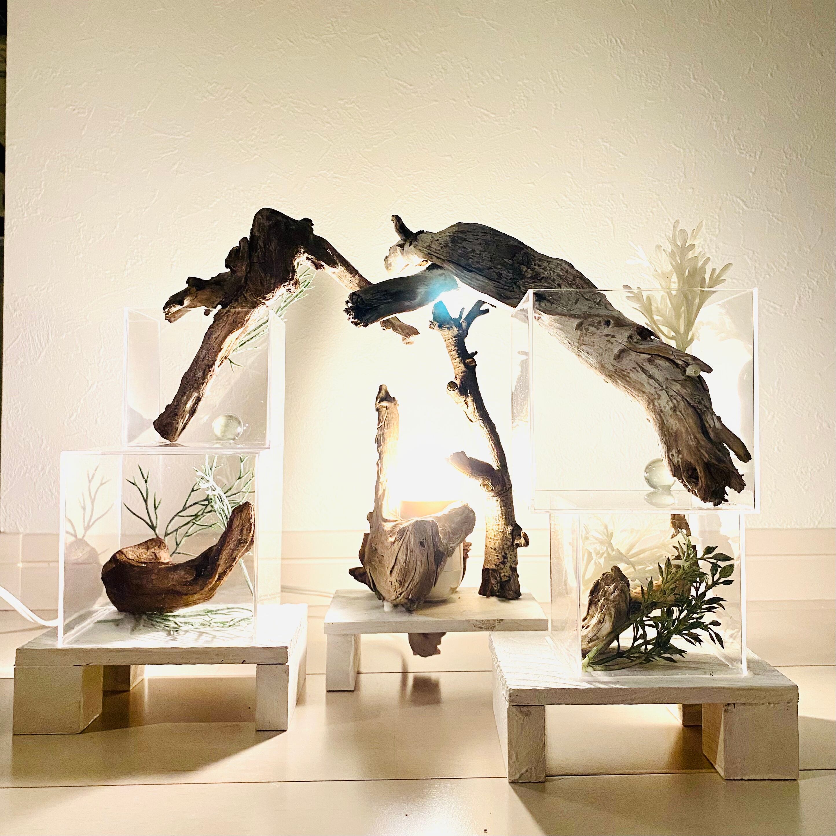 プレートに流木とライトを組み込んだ癒しのアート作品です