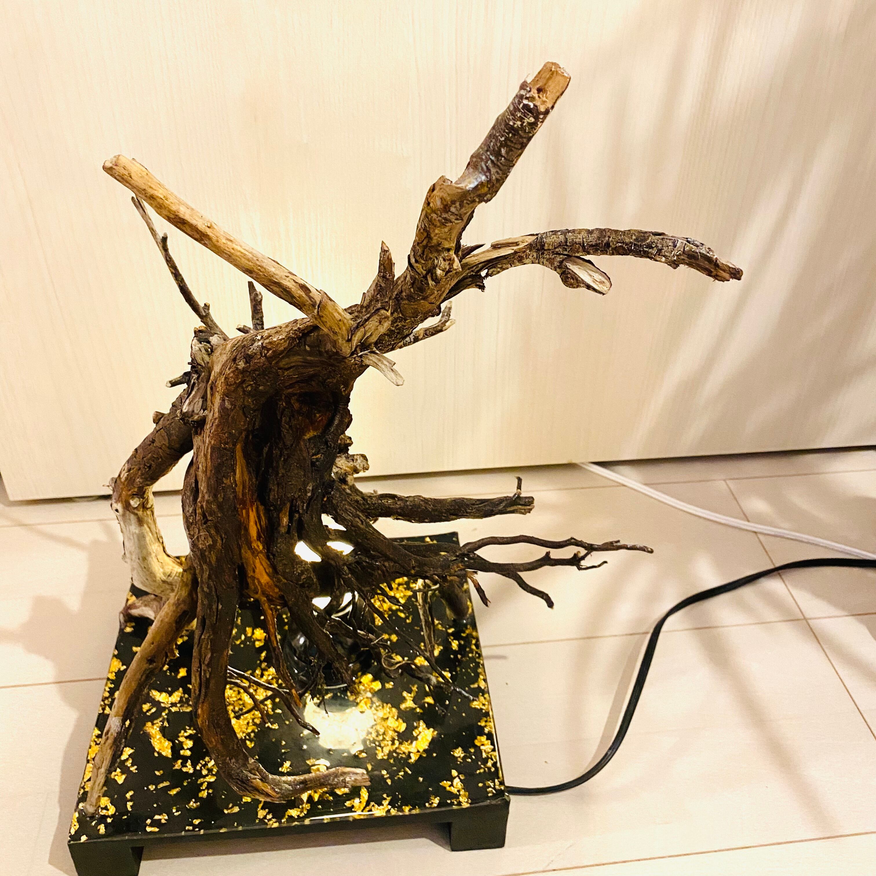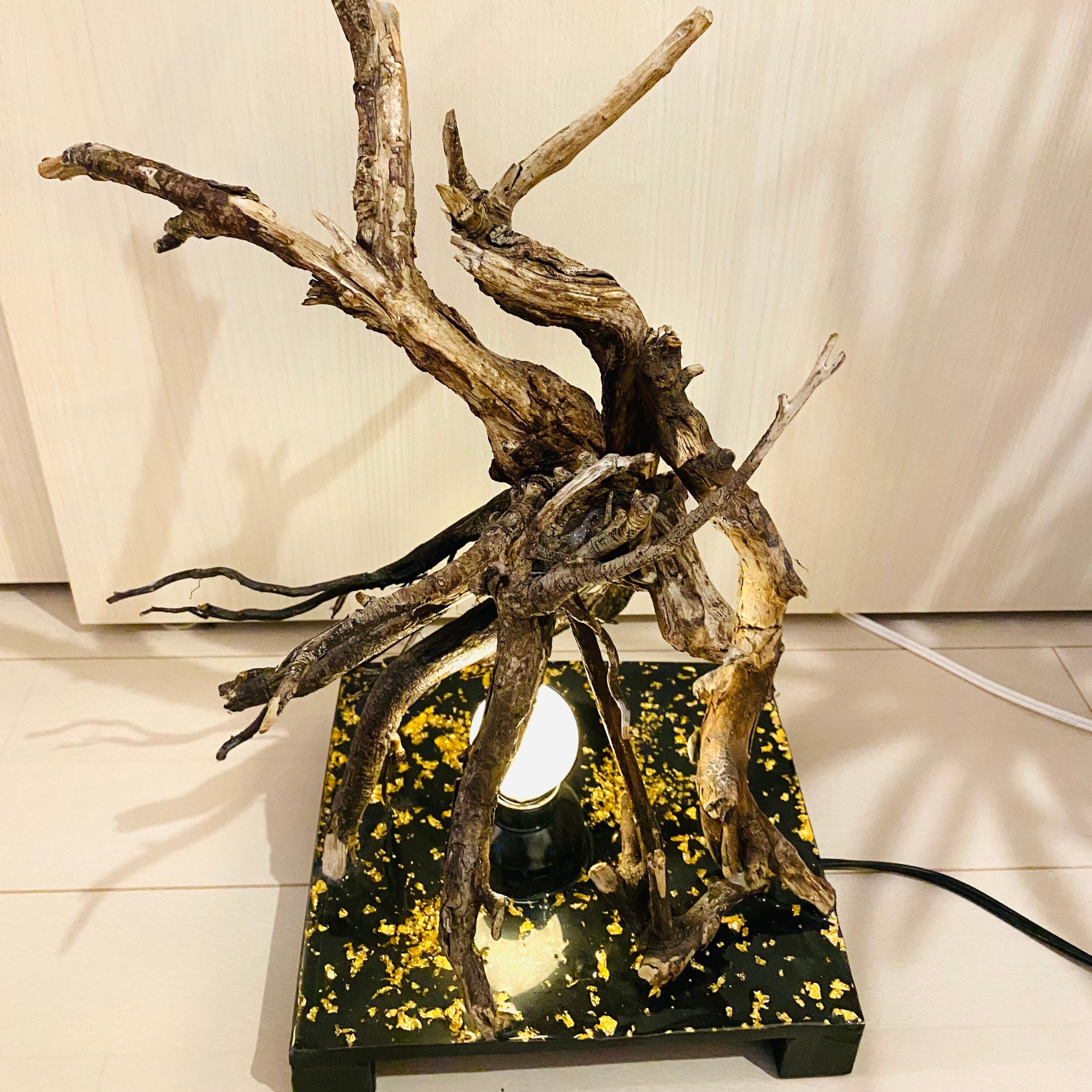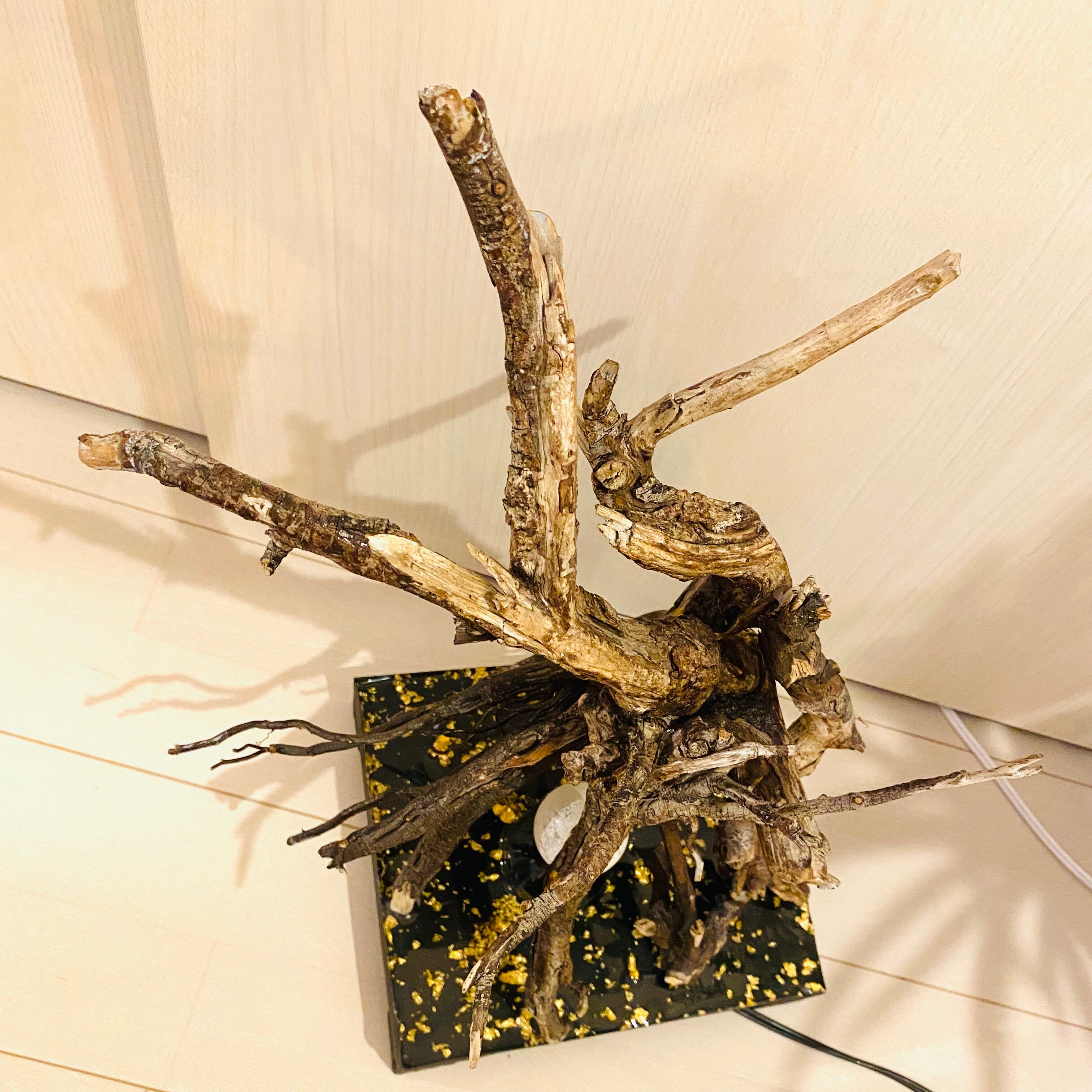 プレートに流木とライトを組み込んだ癒しのアート作品です