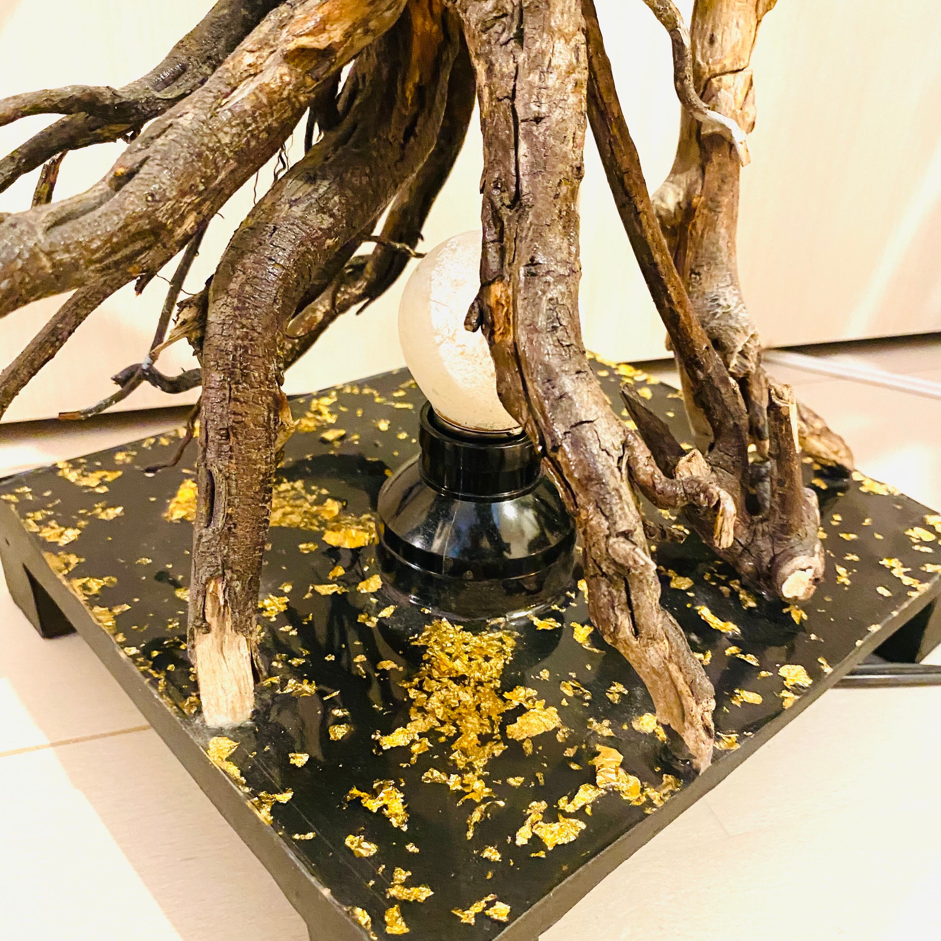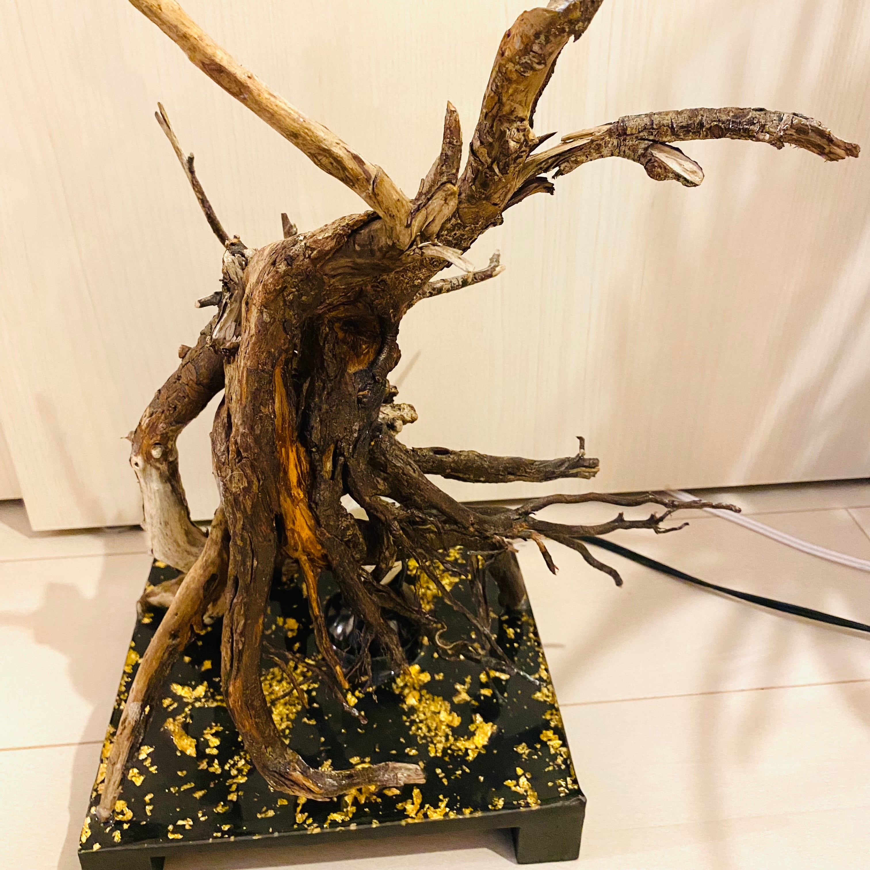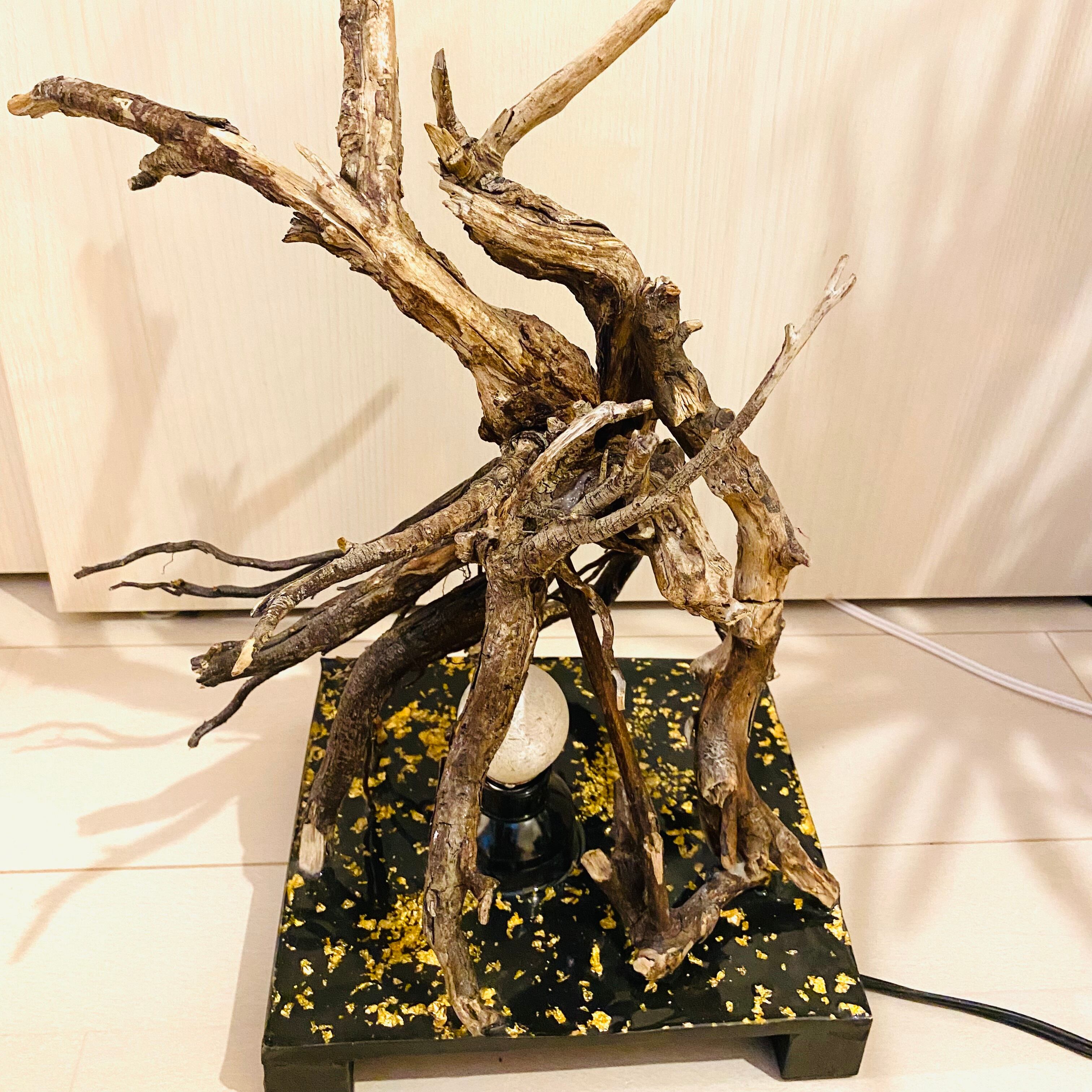 プレートに流木とライトを組み込んだ癒しのアート作品です