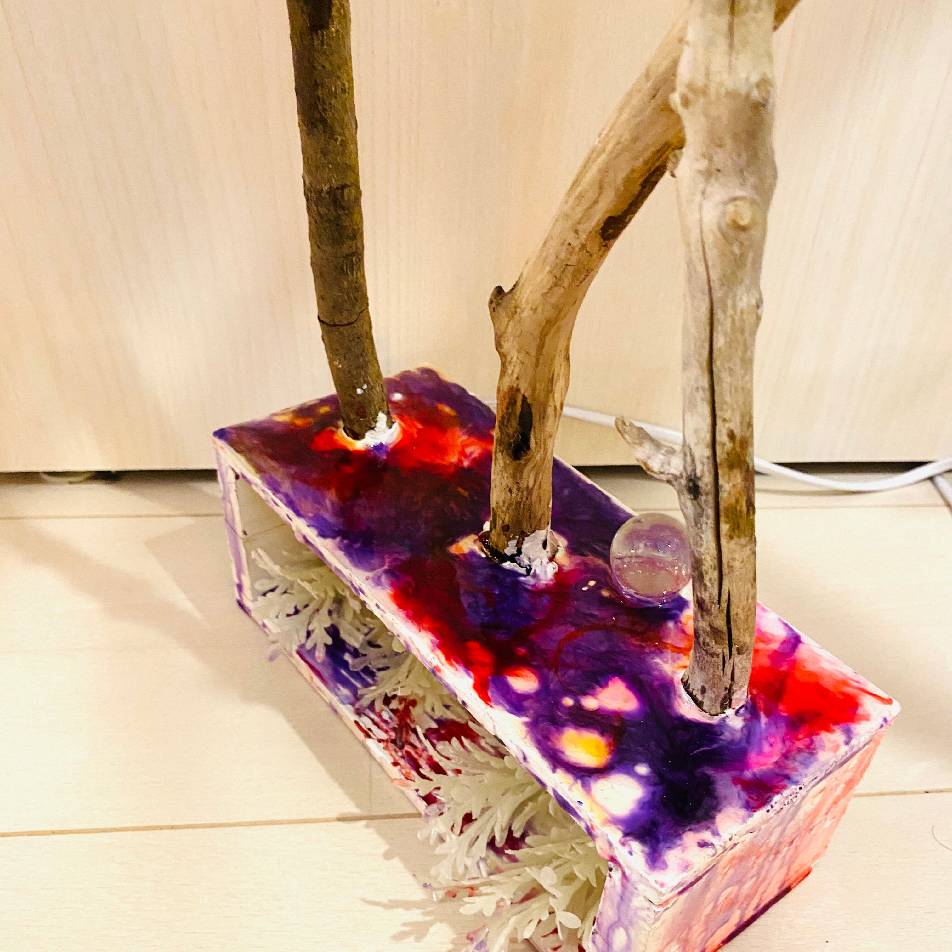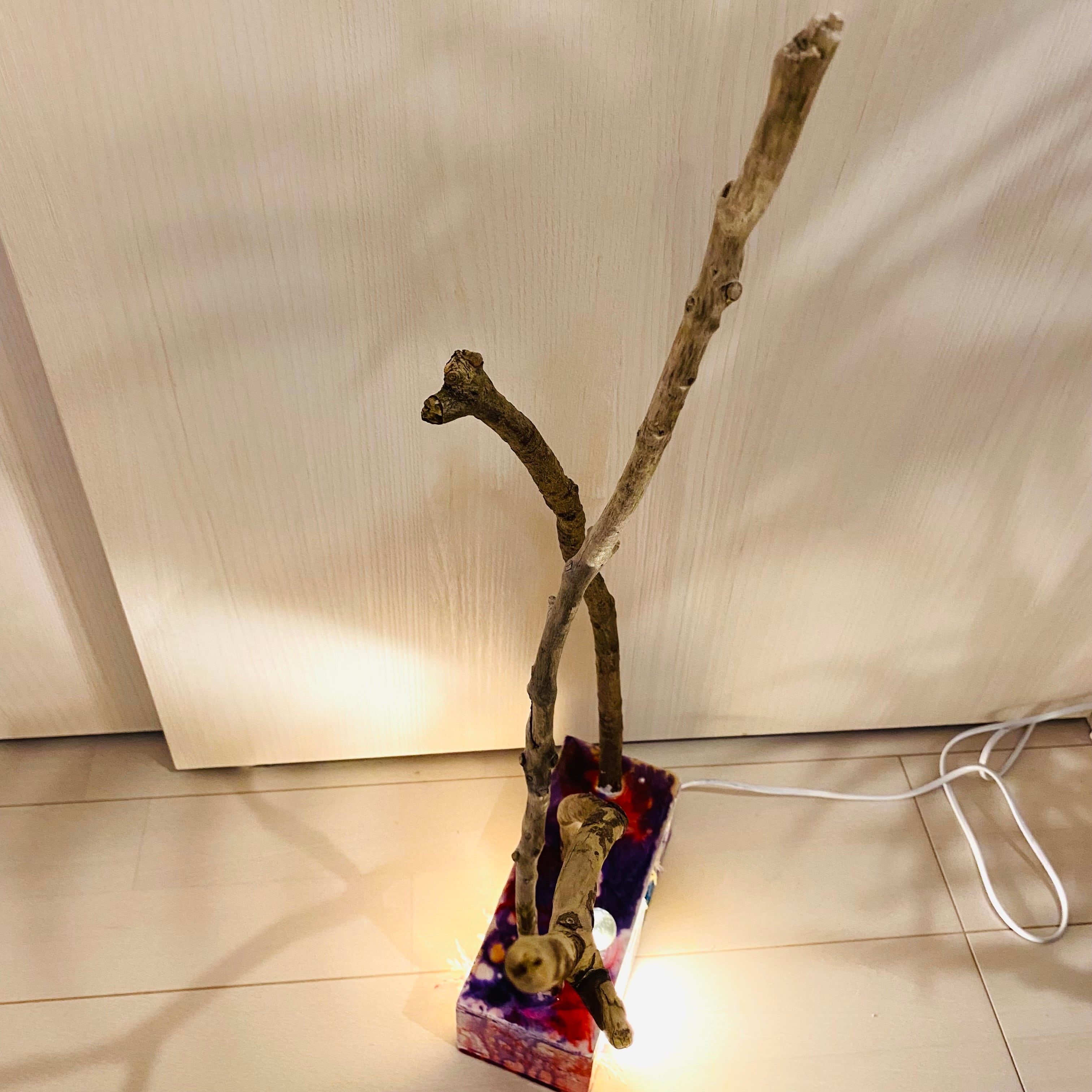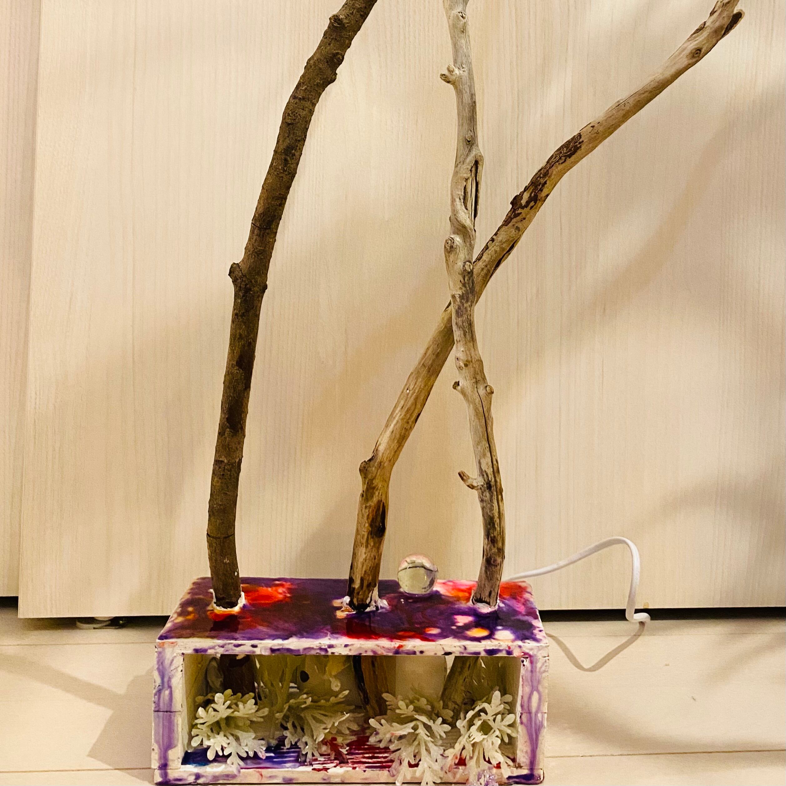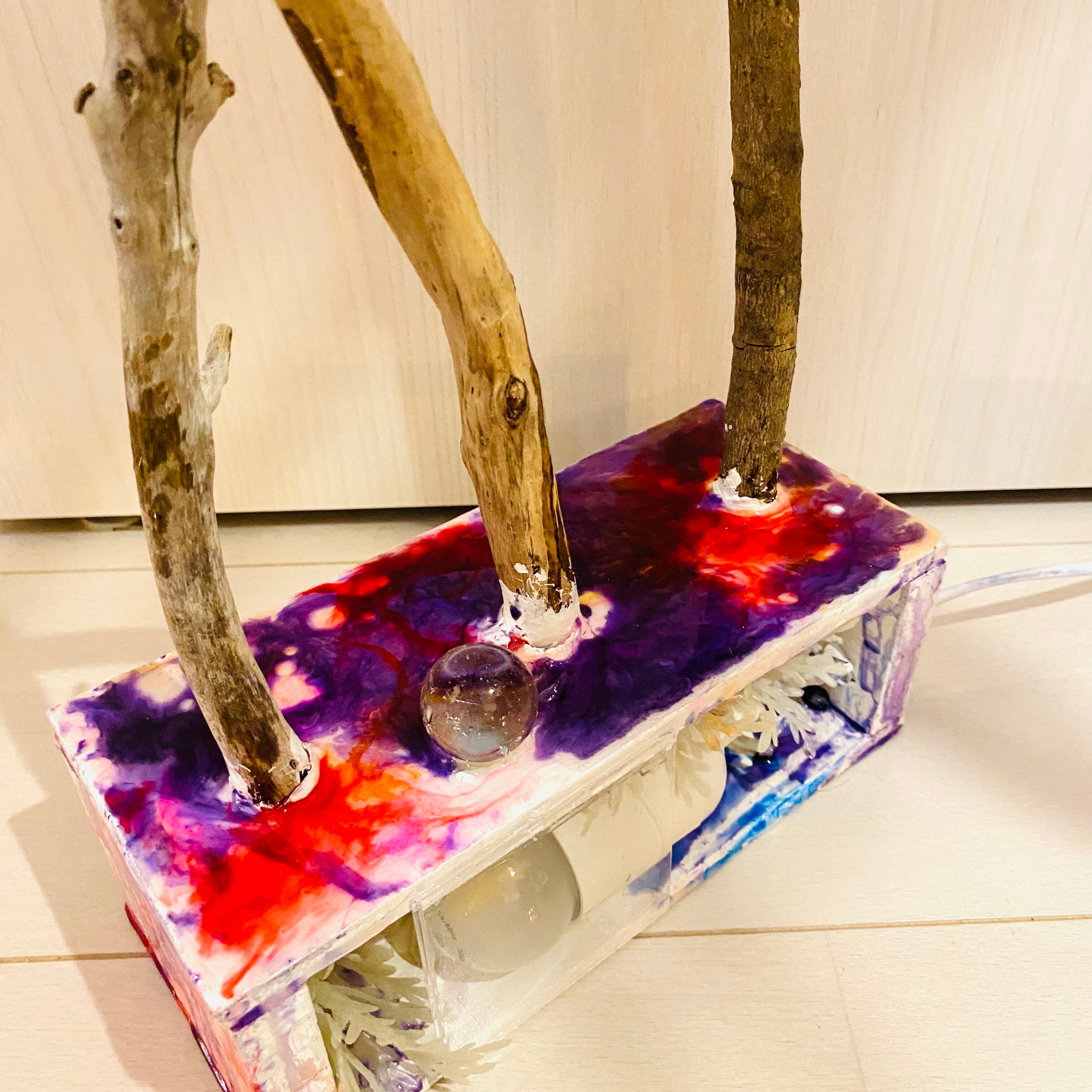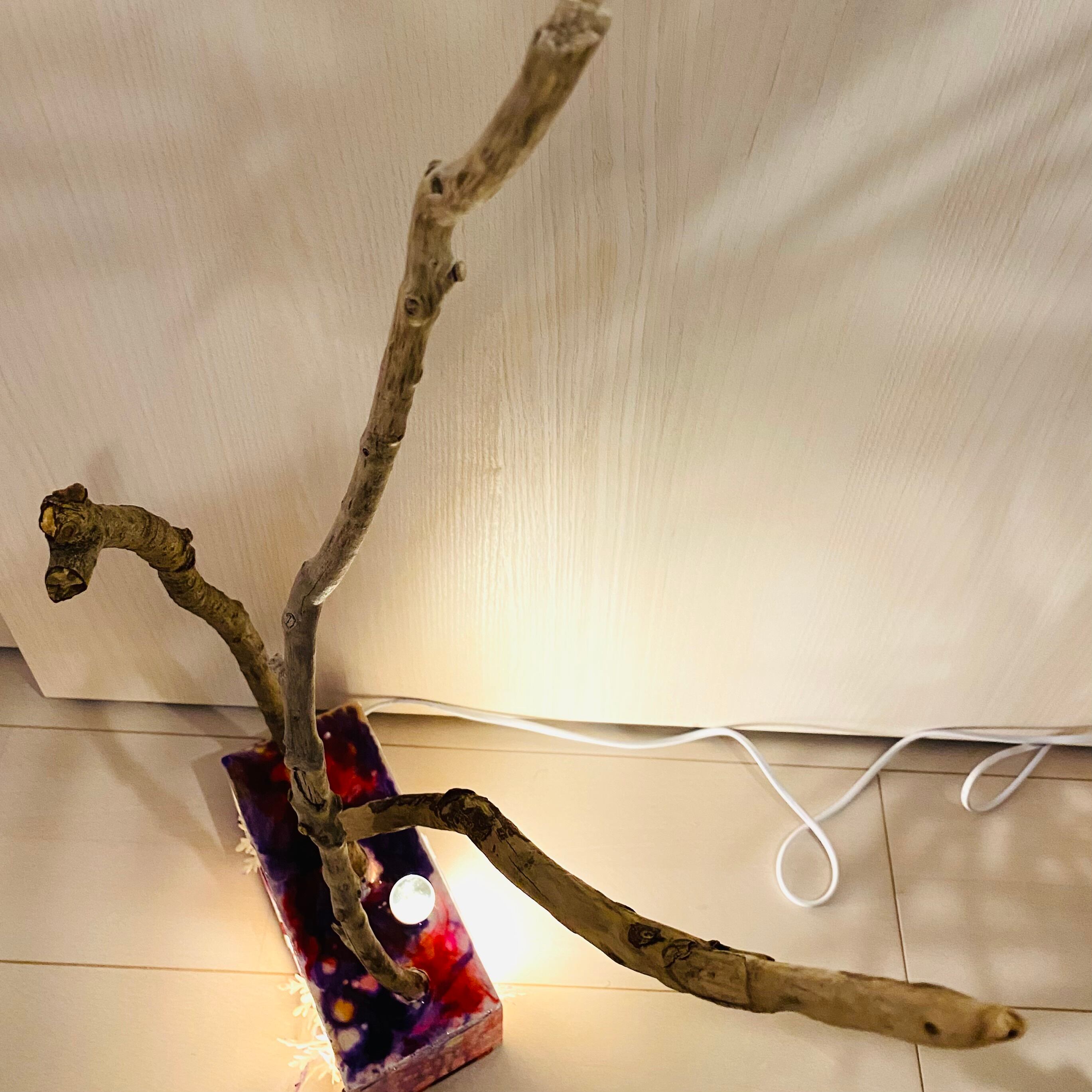 プレートに流木とライトを組み込んだ癒しのアート作品です