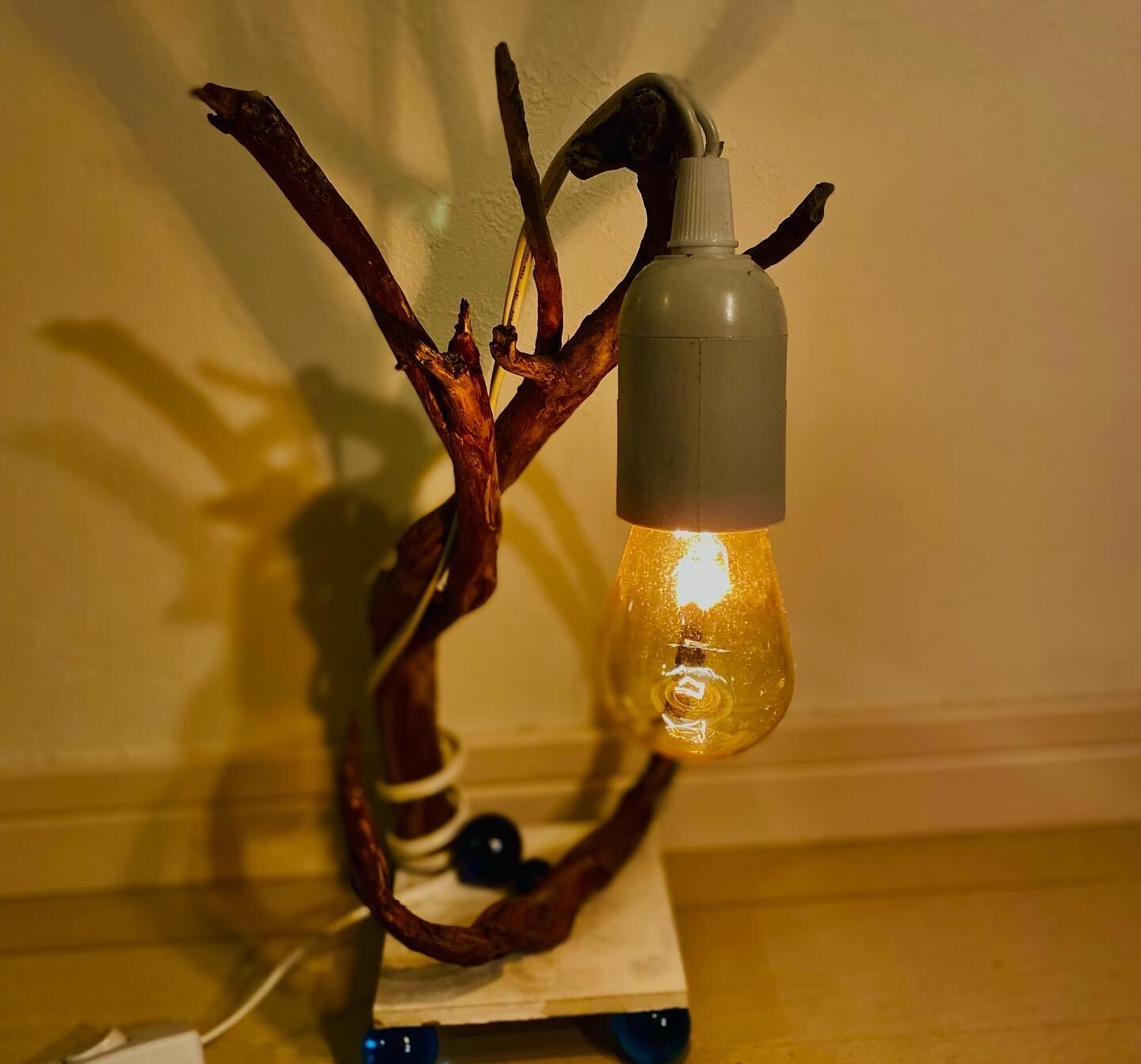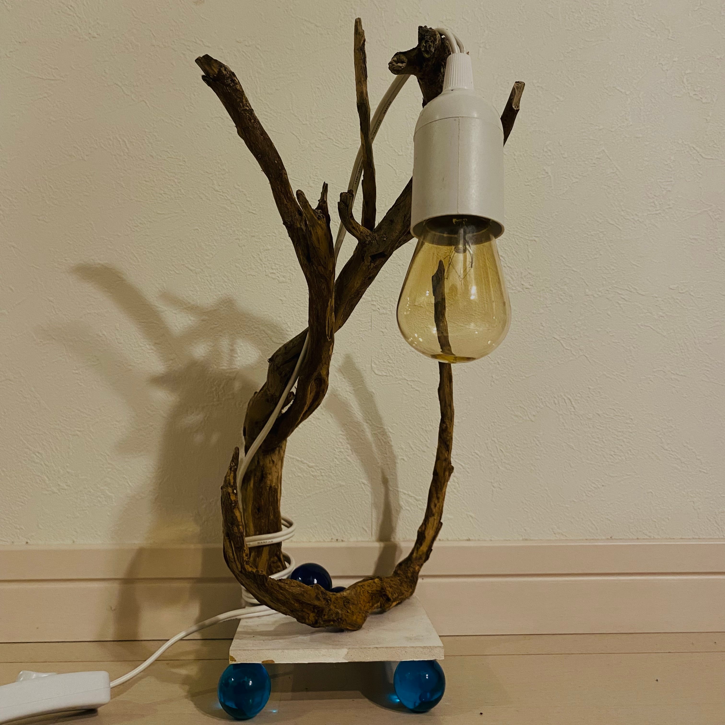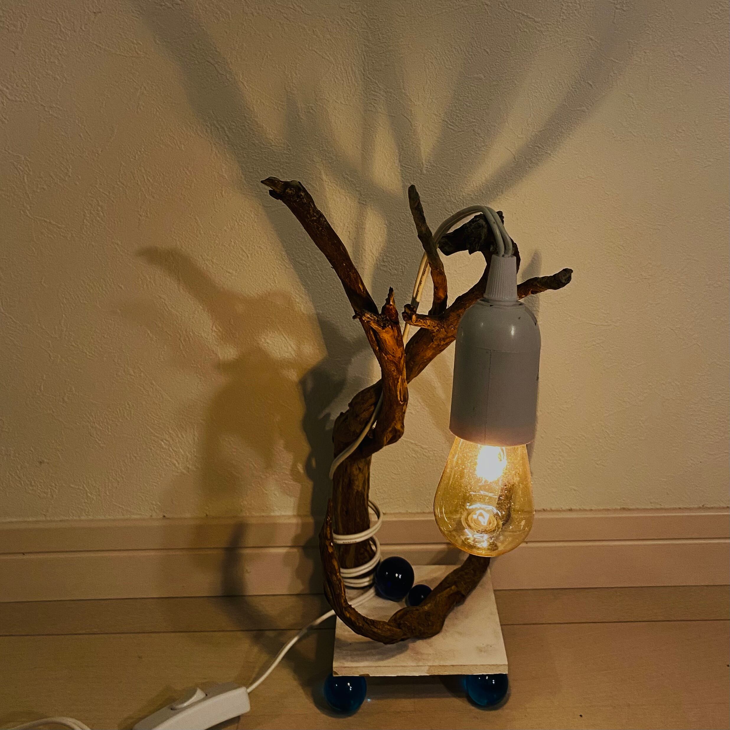 プレートに流木とライトを組み込んだ癒しのアート作品です