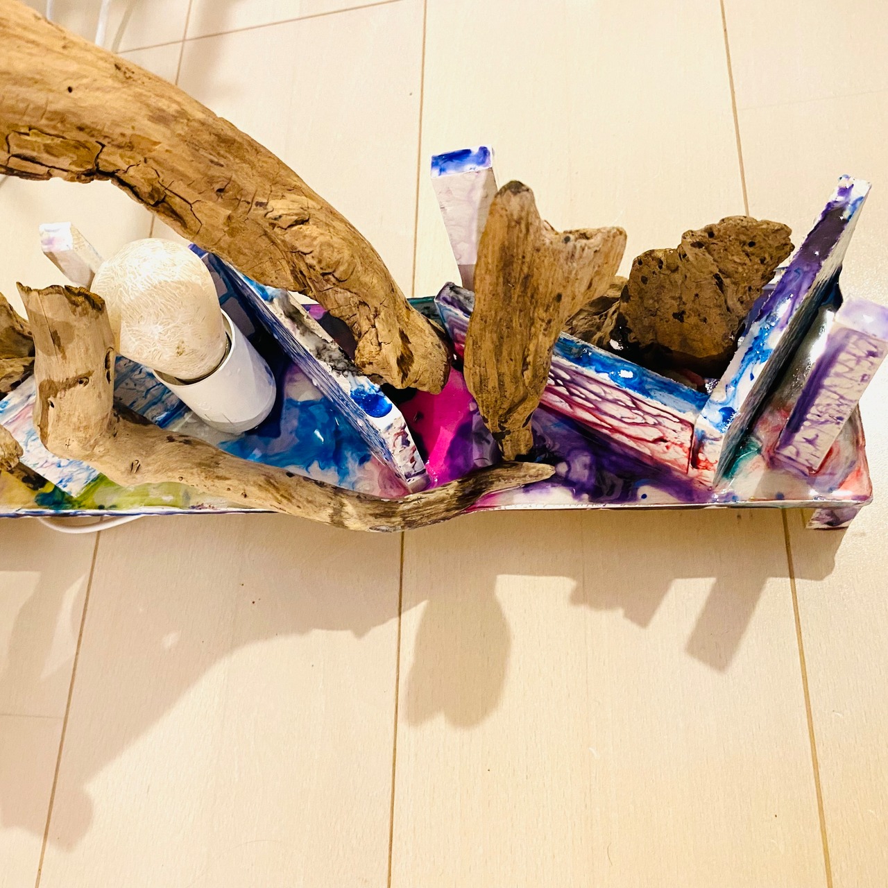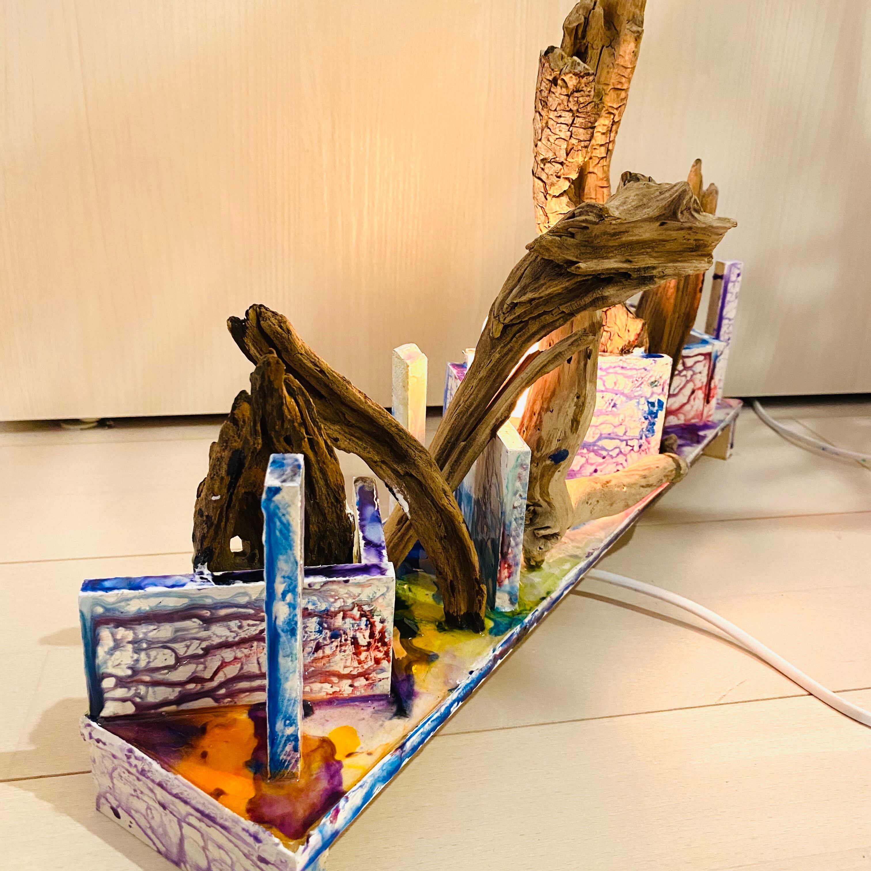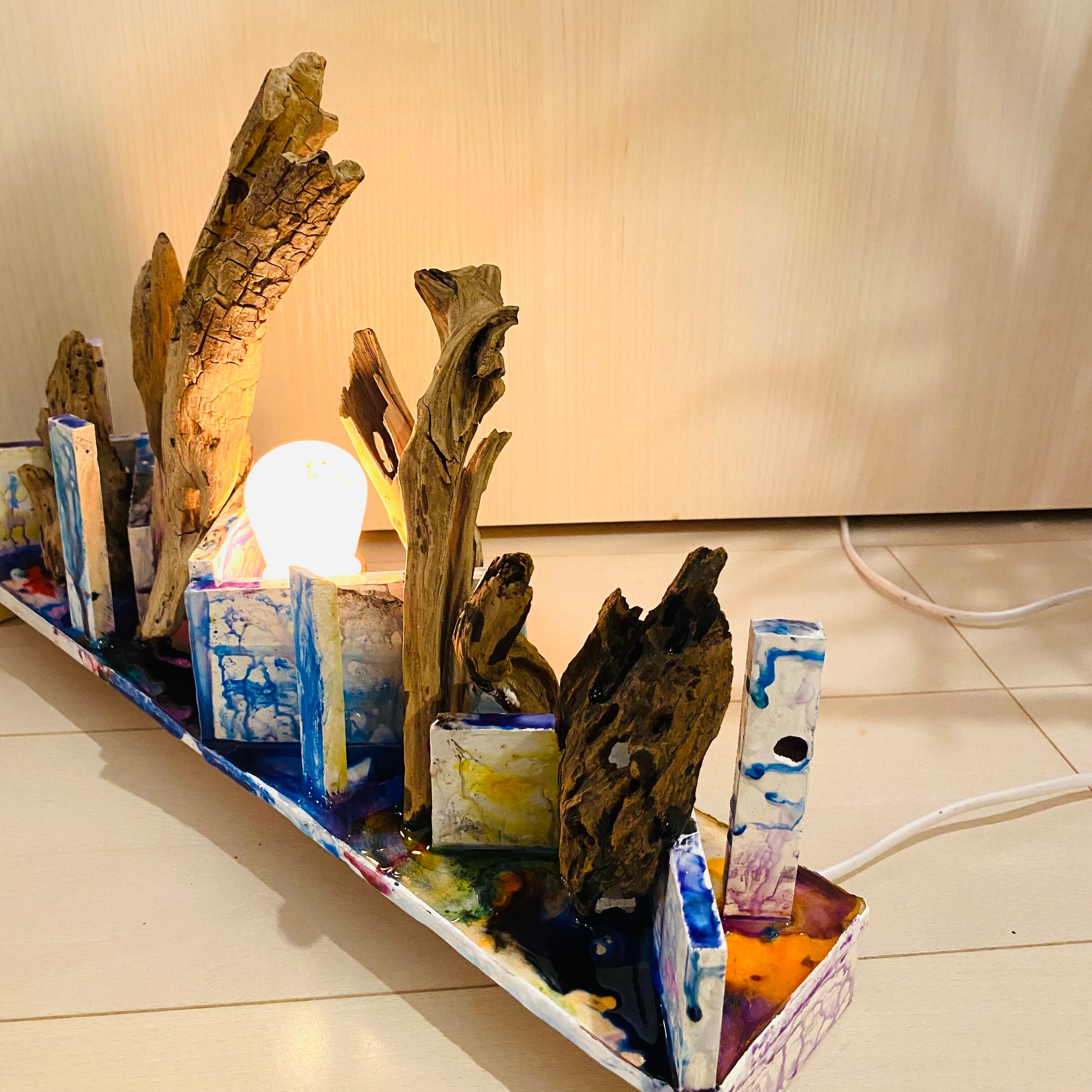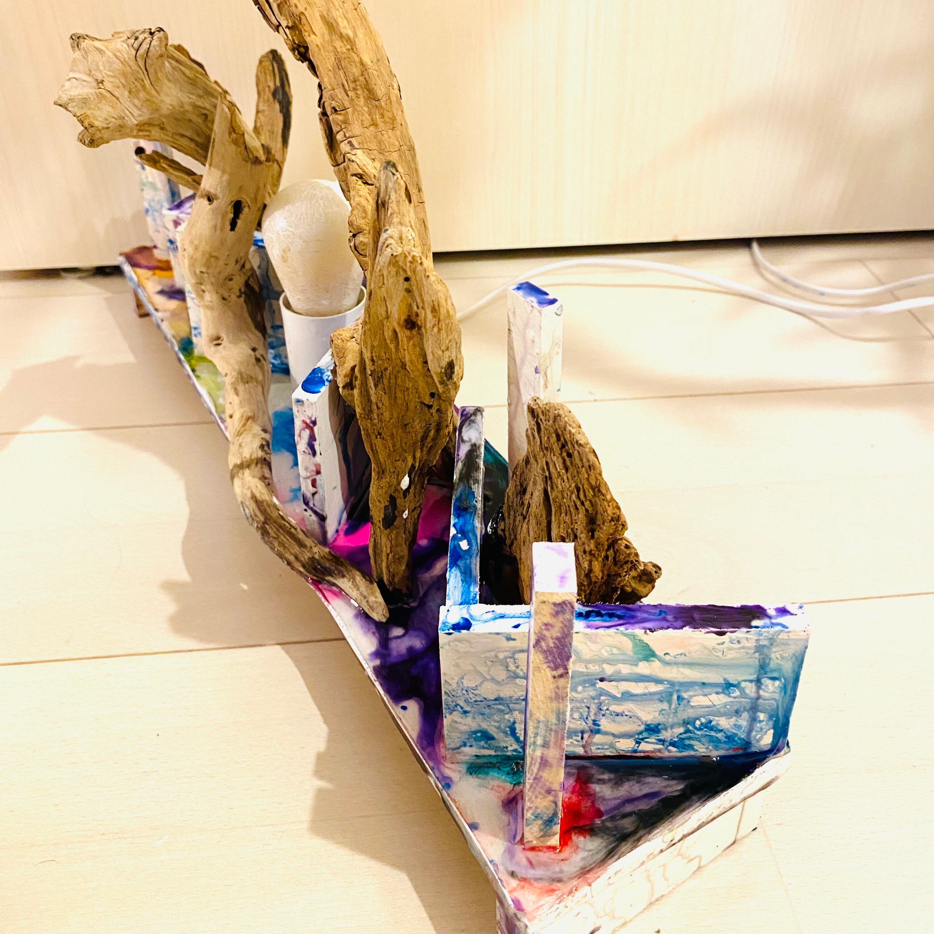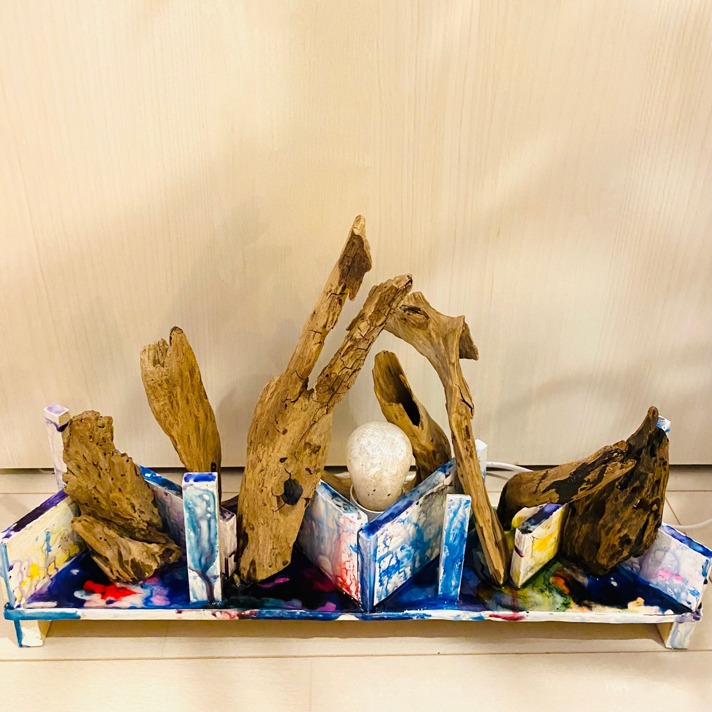 プレートに流木とライトを組み込んだアート作品です