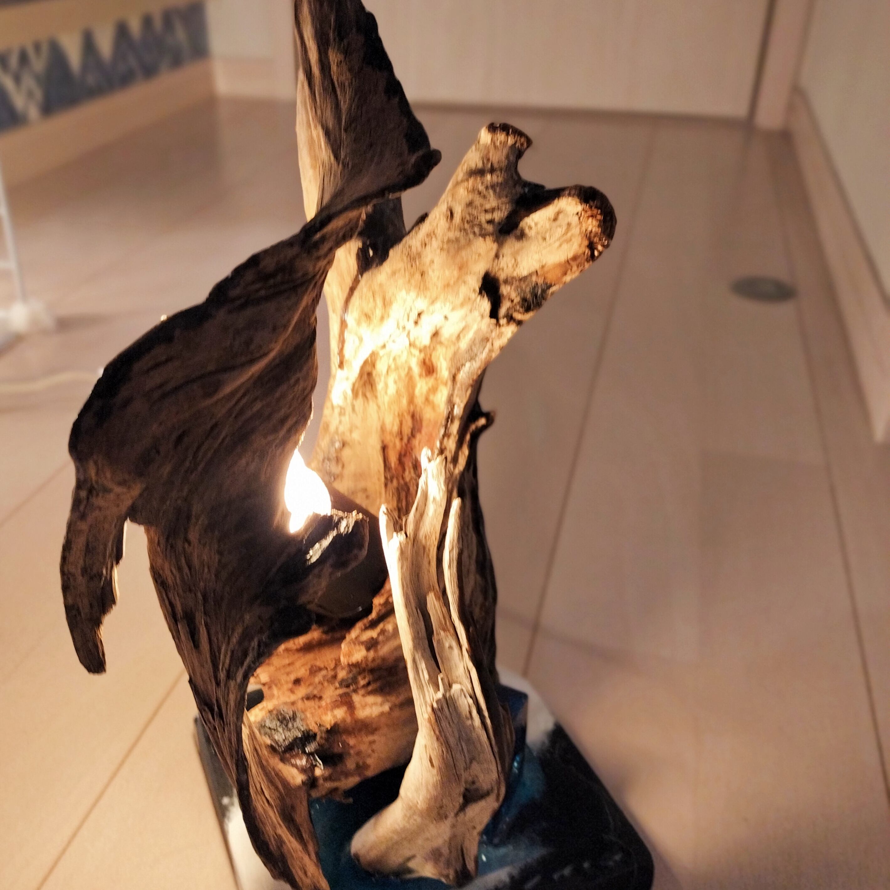 流木レジンアートとLED照明が融合した、オシャレで幻想的な一品。自然の持つ美しさを生かした流木の上に透明な樹脂を流し込み、独自のアートを作り上げました。光が通り抜けるレジンの中に埋め込まれたLED照明が、絶妙な光の演出を生み出します。夜になると部屋に幻想的なアンビエントライトを演出し、心地よい癒しの空間を作り出せます。流木の経年変化や自然の持つ風合いを楽しむことができるだけでなく、インテリアとしても映える一品です。 この商品は限定生産のため、一点一点異なるデザインがあります。大自然の一部を手に入れ、癒される特別なひとときを過ごしてください。